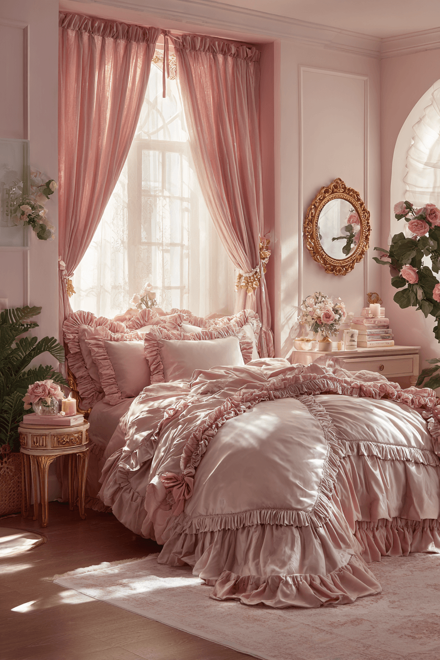 Delicate textures and charming details define girlie room decor inspired by coquette aesthetics. Ruffled bedding, dainty bows, and soft blush tones create a playful yet refined environment. Subtle gold accents and airy furniture enhance the elegance without overpowering the softness. Warm, diffused lighting brings everything together seamlessly. The result is a dreamy, thoughtfully styled retreat. Explore more girlie room decor ideas with a romantic twist.
