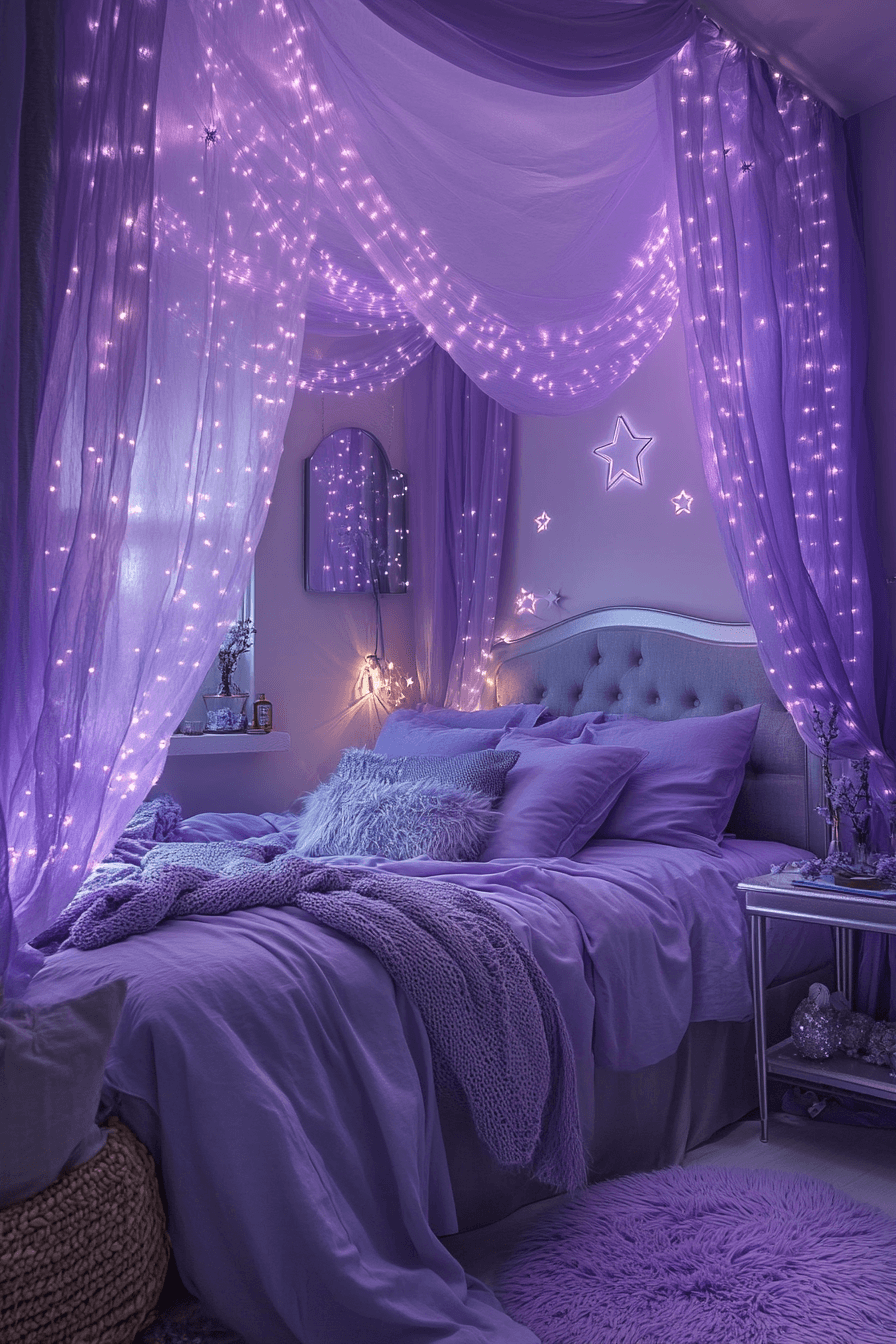 Soft lavender tones paired with gentle lighting can transform girlie room decor into a dreamy retreat. Lilac walls, subtle LED glows, and crisp white furniture create a calming and modern aesthetic. Transparent decor elements and chrome accents add depth without cluttering the space. Layered lighting helps create a soothing ambiance ideal for winding down. The room feels peaceful and effortlessly ethereal. Explore more girlie room decor ideas with calming color palettes.