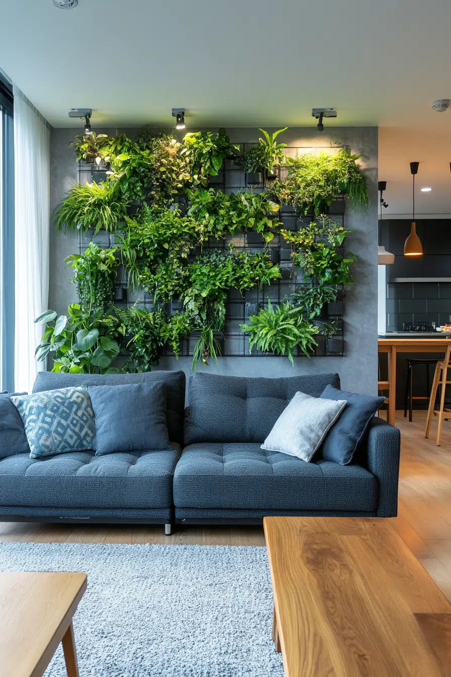 This living room proves that a vertical garden can be the ultimate statement piece. The dramatic dark wall creates the perfect backdrop for vibrant greenery to pop.