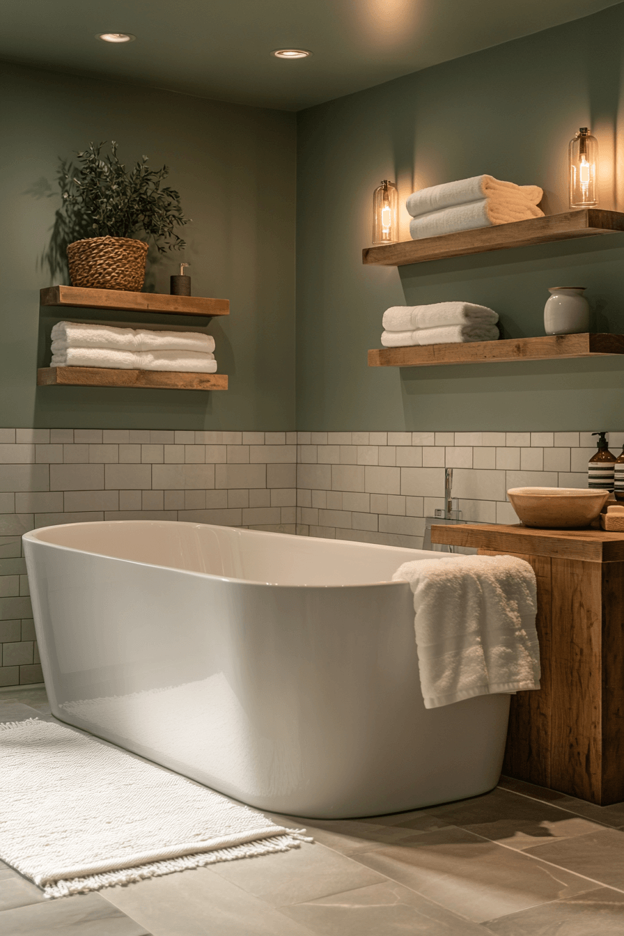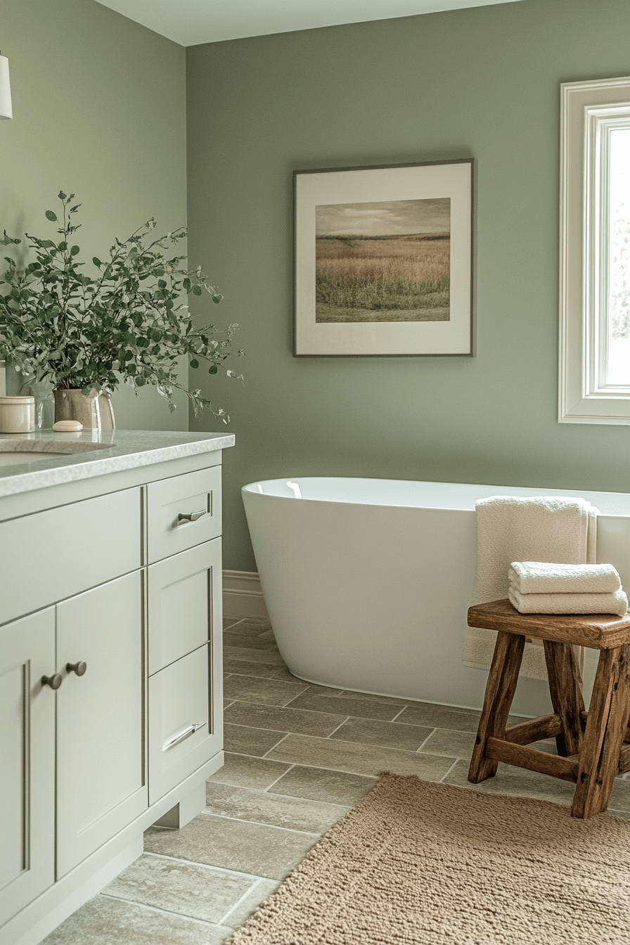 A light sage green bathroom feels like stepping into a gentle retreat at the end of a long day. The soft green hue instantly calms the senses, especially when layered with plush white towels and warm wood accents. The beauty of this shade is how it feels refreshing without ever overpowering the space. Thoughtful lighting adds a delicate glow that enhances the peaceful atmosphere. The entire room becomes airy, soothing, and quietly luxurious. Bring this spa-inspired serenity into your home and refresh your space.