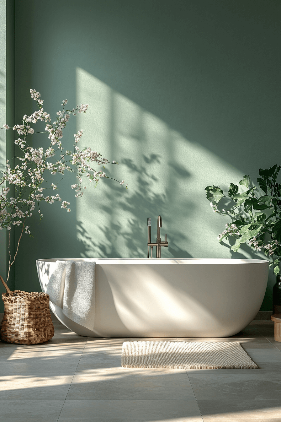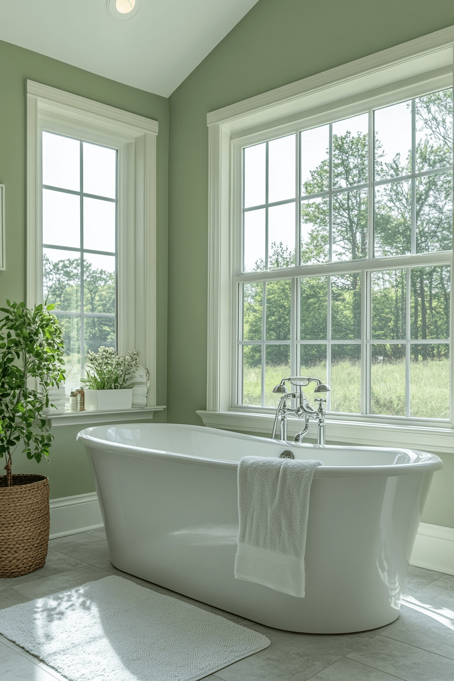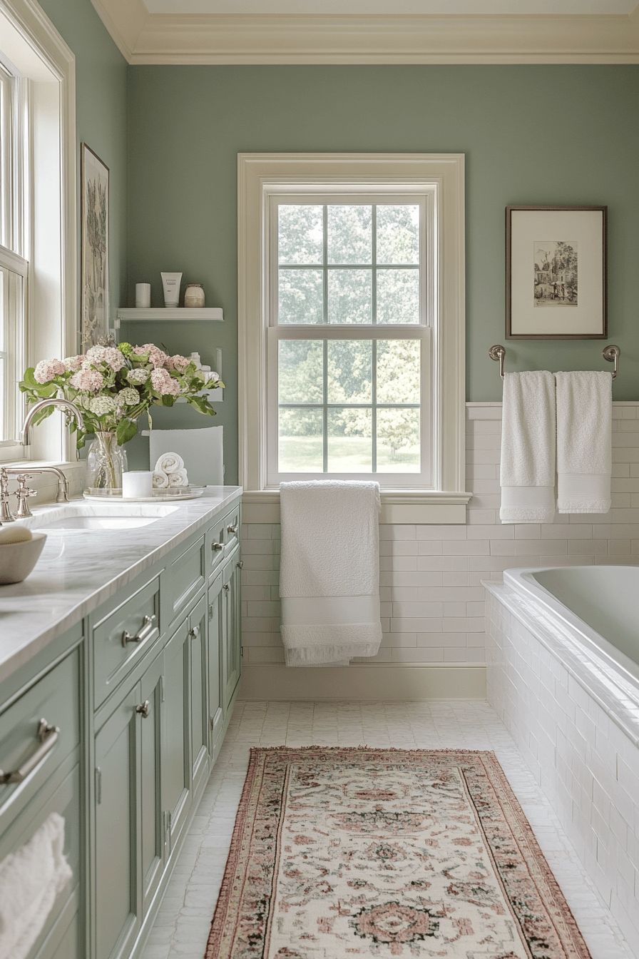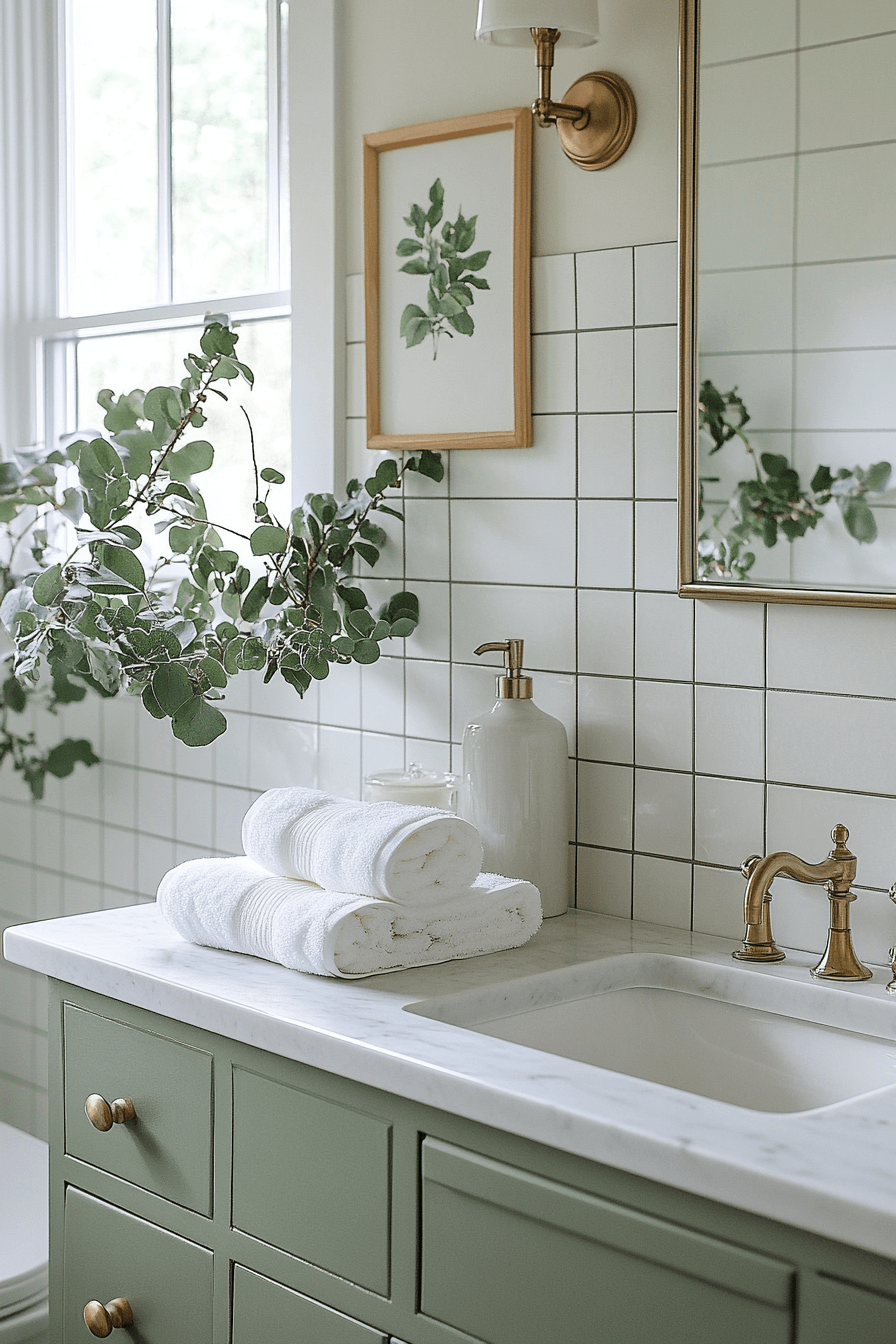 An accent wall can make a light sage green bathroom shine without overwhelming the space. One painted or tiled wall adds personality while preserving flexibility. The subtle contrast enhances the room’s architecture. Crisp white details keep the look sharp and fresh. The effect is impactful yet refined. Refresh your space with this simple but transformative detail.