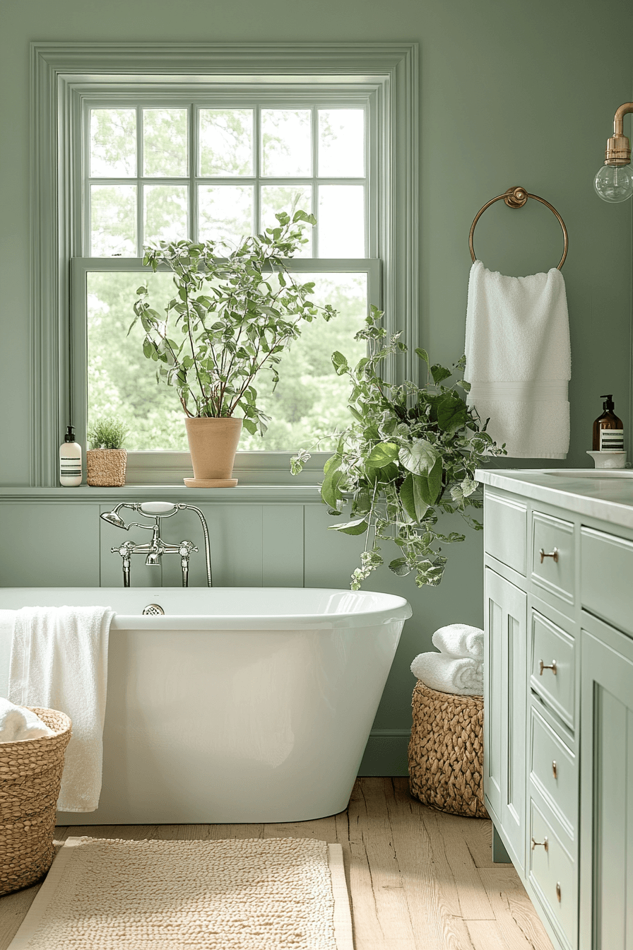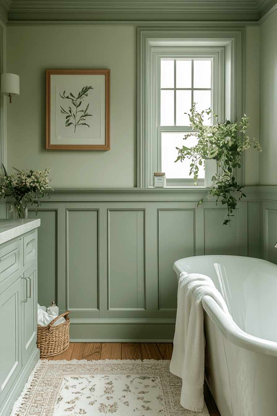 Modern wainscoting gives a light sage green bathroom architectural character. The lower wall detail adds subtle depth. Sage keeps the structure feeling fresh and bright. Crisp upper walls complete the refined contrast. The result feels classic with a contemporary twist. Enhance your bathroom with this tailored detail.