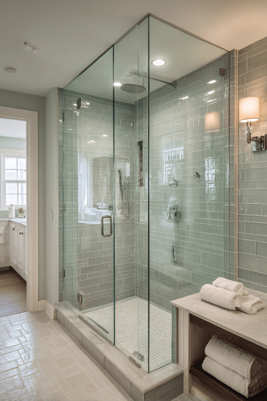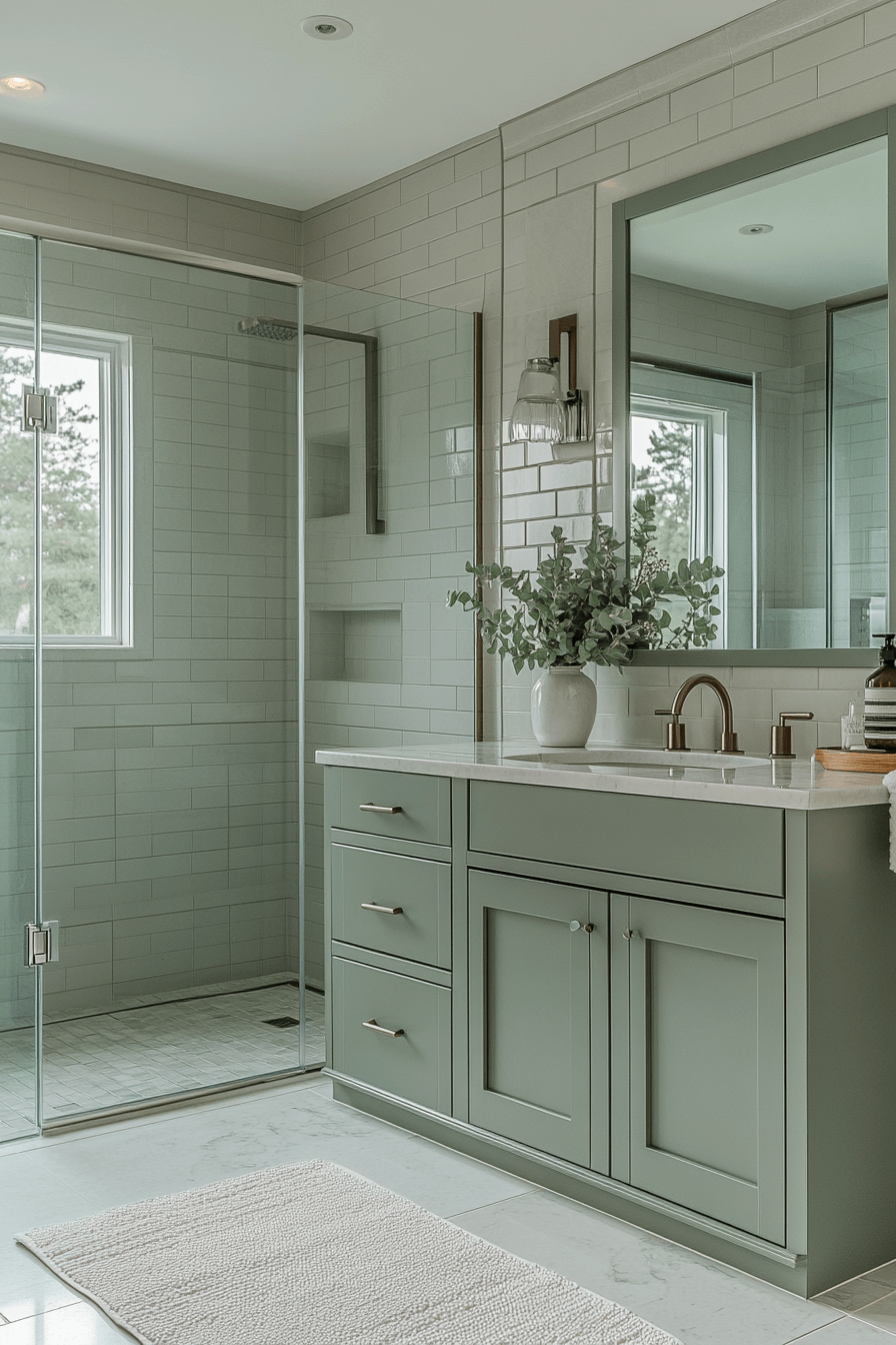 A softly colored shower space transforms a light sage green bathroom into a tranquil escape. The gentle green wraps the shower in calm, spa-like energy. Natural light plays beautifully against glass enclosures. Contrasting fixtures add just enough definition. Every detail feels intentional and soothing. Turn your shower into a peaceful sanctuary with this elegant approach.