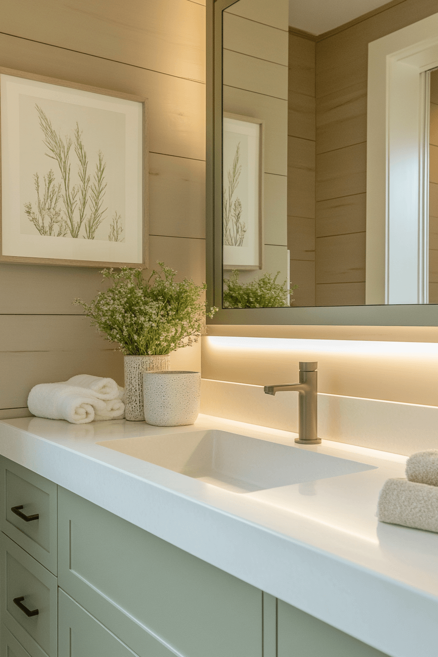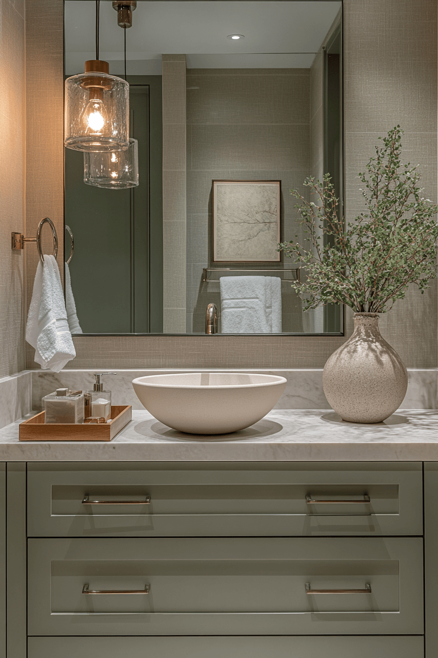 Even compact powder rooms benefit from a light sage green bathroom palette. The color introduces personality while maintaining openness. Sage feels bold yet gentle at the same time. Dramatic mirrors or lighting can add extra flair. The result feels intimate but elevated. Transform your small space with this refined shade.