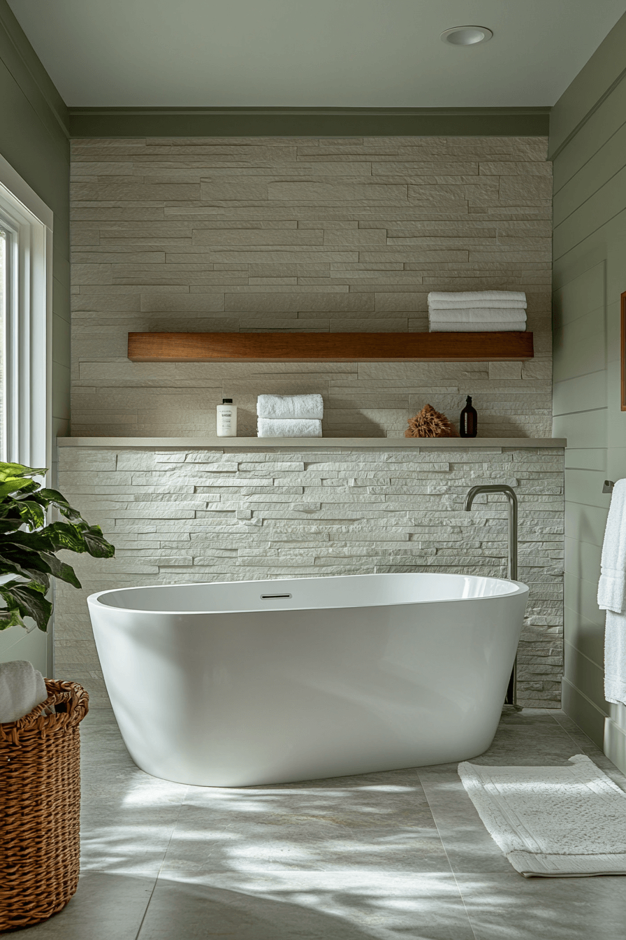 Natural stone textures bring organic richness to a light sage green bathroom. The earthy materials complement the soft green beautifully. Together they create a spa-like ambiance rooted in nature. Keeping the palette simple allows textures to shine. The overall vibe feels serene and grounded. Introduce stone accents for a tranquil retreat feel.