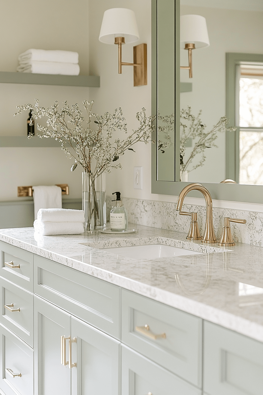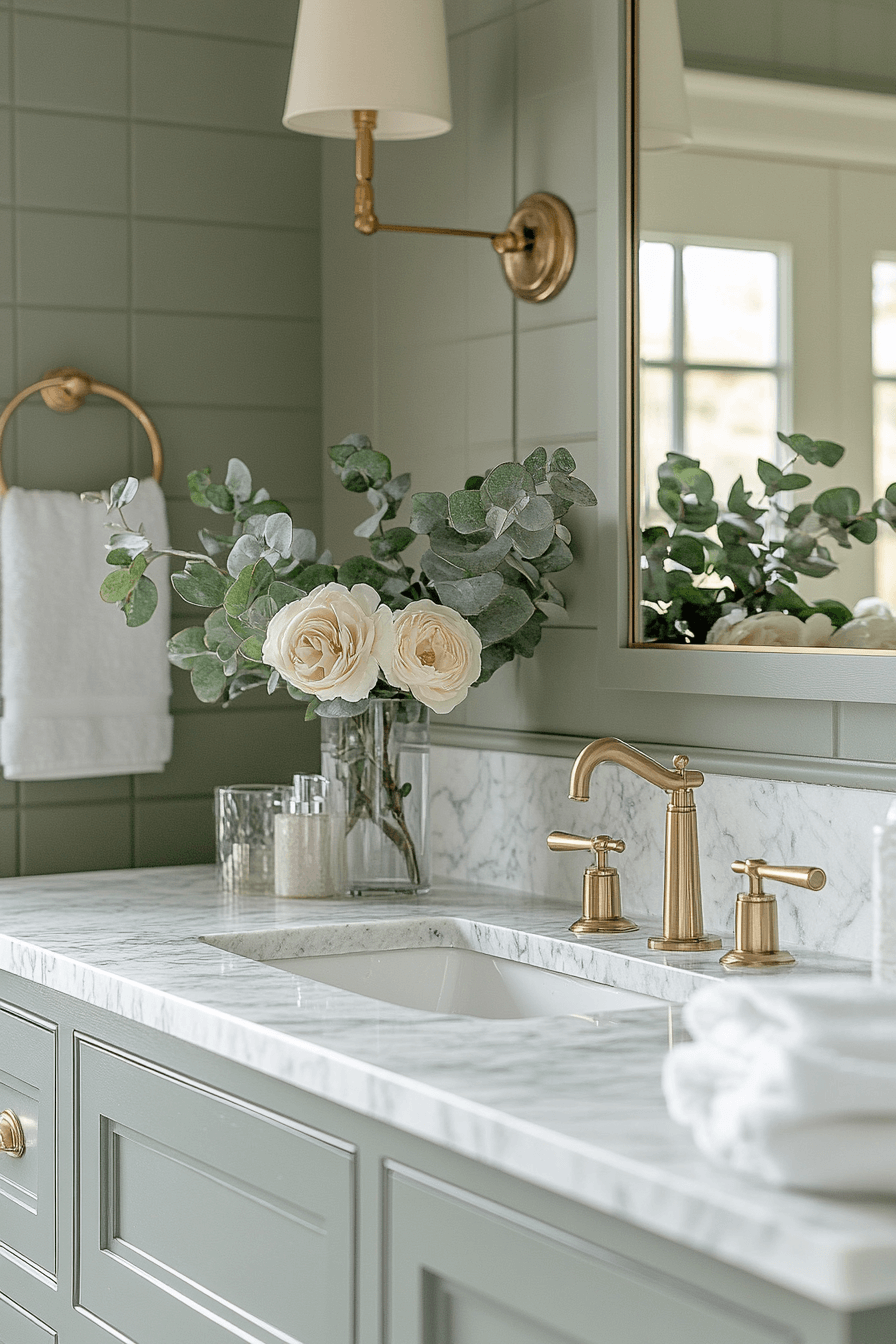 Marble accents bring instant elegance to a light sage green bathroom. The delicate veining pairs beautifully with the soft green backdrop. Together they create a look that feels serene yet elevated. Warm metallic finishes tie the palette together seamlessly. The space feels bright, refined, and effortlessly graceful. Add marble details to give your sage bathroom a sophisticated lift.