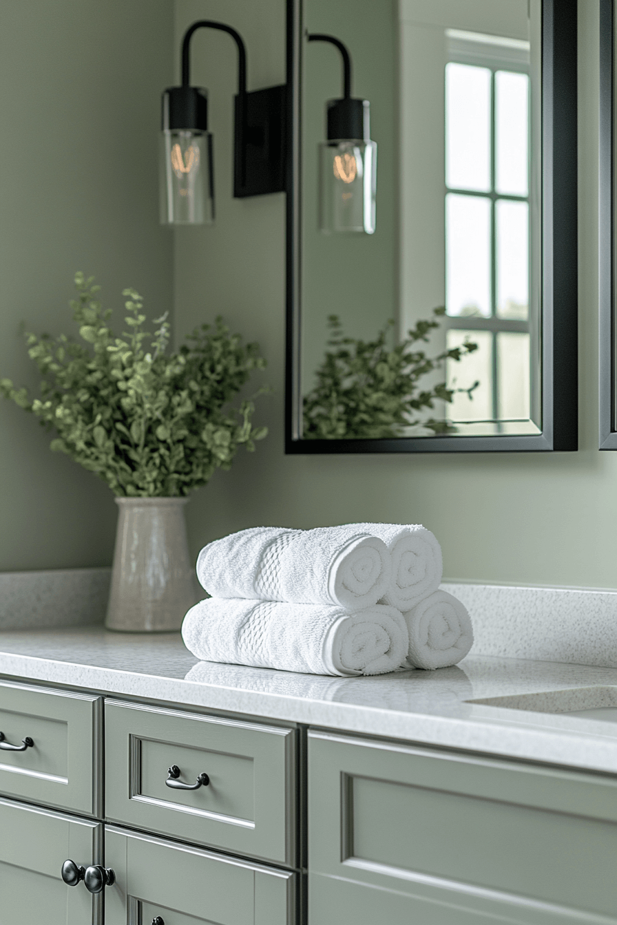 Introducing black accents adds crisp definition to a light sage green bathroom. The contrast sharpens the gentle green while maintaining harmony. A framed mirror or matte fixtures create modern edge. The combination feels stylish yet soothing. The space gains personality without heaviness. Add bold accents to give your sage design depth.