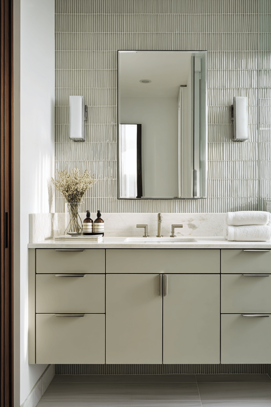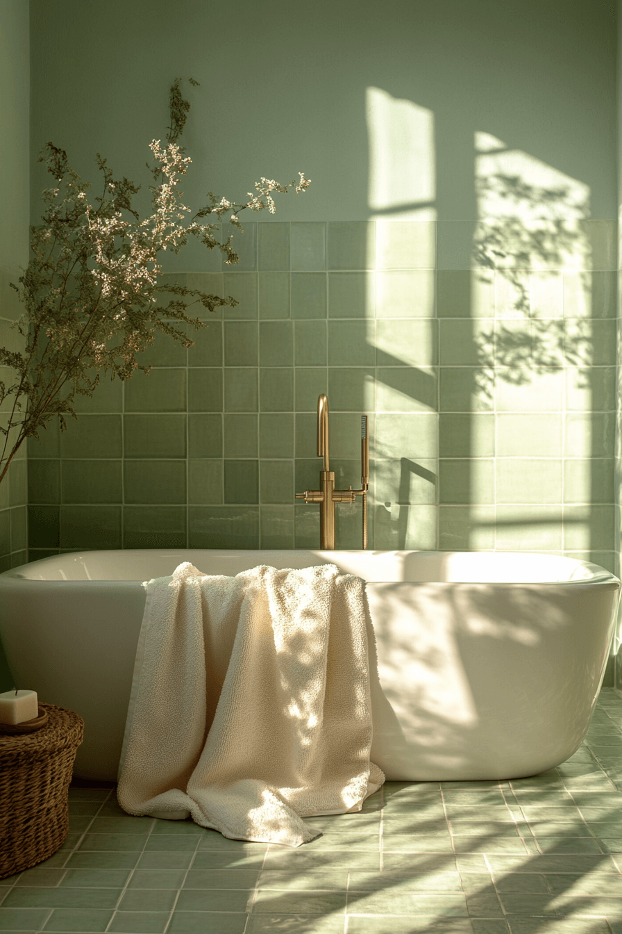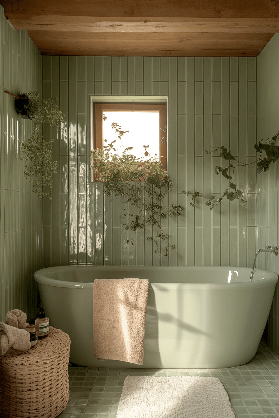 Vertical tile layouts enhance height in a light sage green bathroom. The upward lines create the illusion of taller walls. Sage tones soften the structured pattern. Minimal décor keeps the tile detail as the star. The room feels sleek and expansive. Incorporate vertical lines for architectural impact.