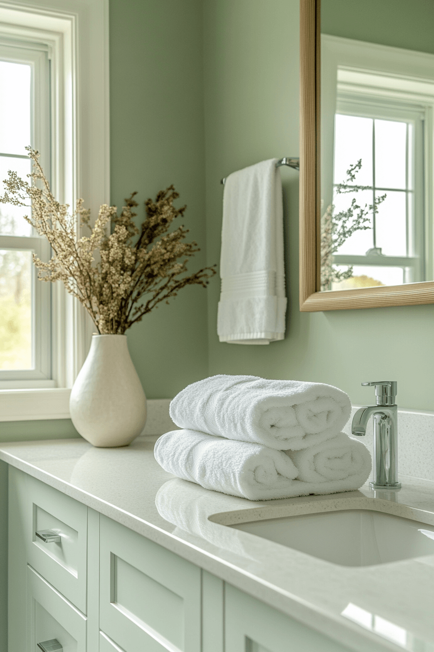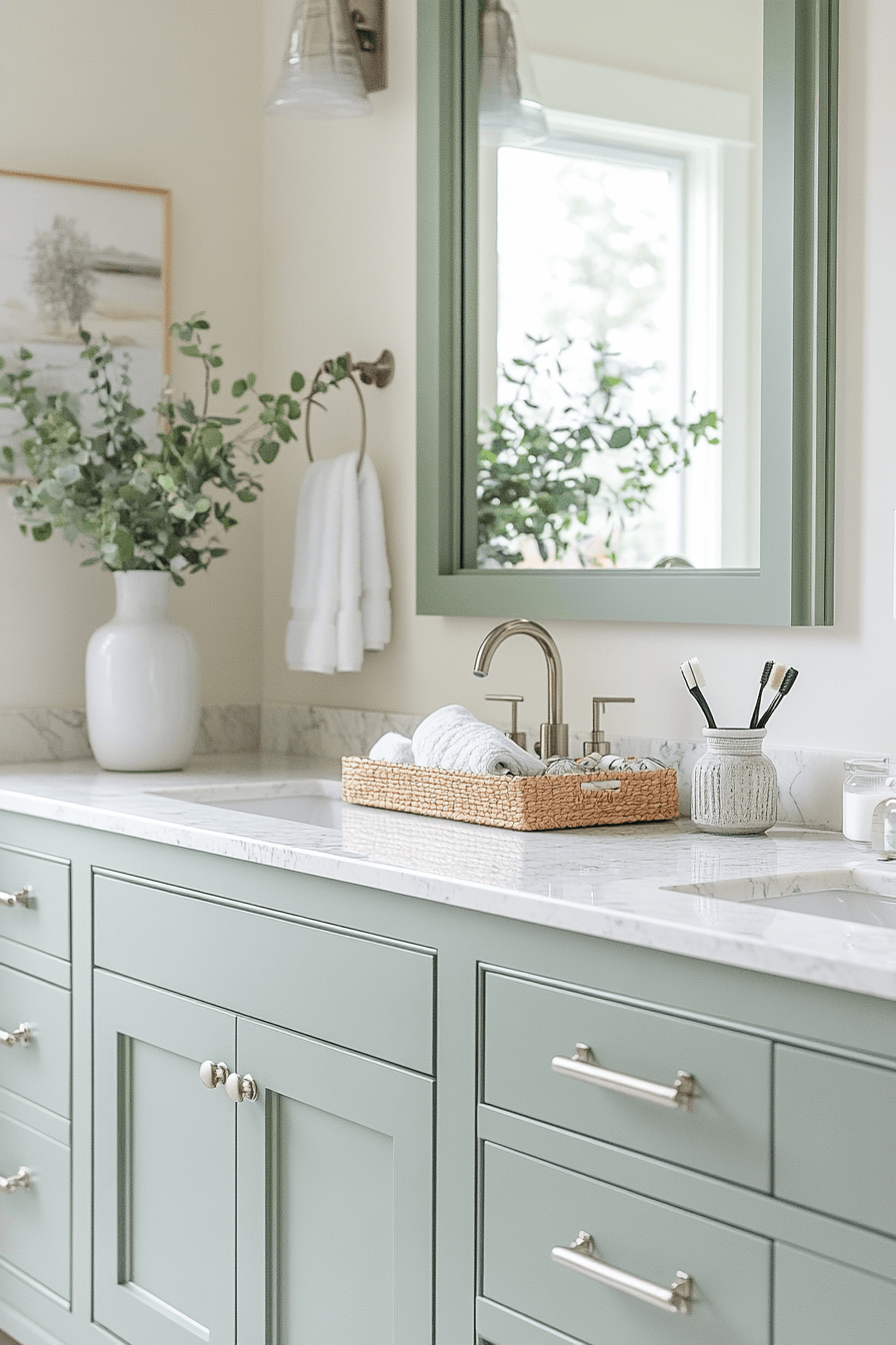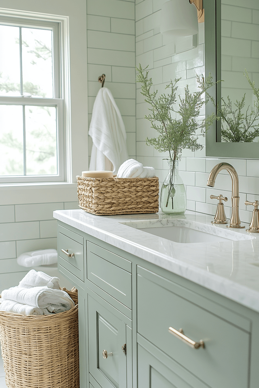Creamy neutral accents layered into a light sage green bathroom create warmth and balance. The soft beige tones complement sage beautifully. This pairing feels inviting without sacrificing brightness. Gentle textures in towels and rugs add cozy depth. The overall look feels harmonious and restorative. Blend sage and cream for a welcoming atmosphere.