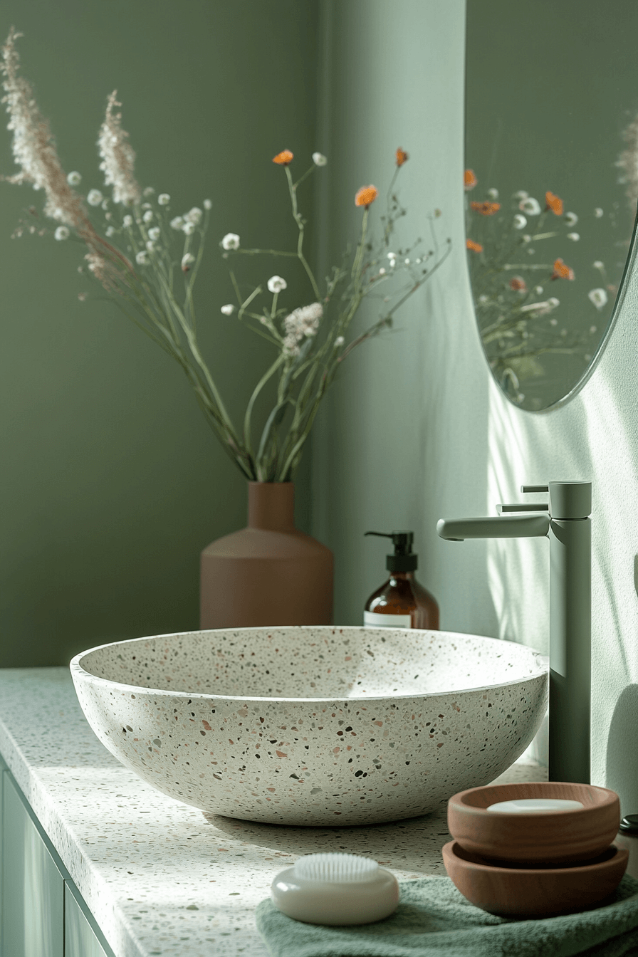 Terrazzo introduces playful energy into a light sage green bathroom while maintaining balance. The speckled surface adds character without chaos. Sage tones calm the lively pattern. Keeping accessories minimal ensures cohesion. The finished look feels creative yet polished. Blend terrazzo with sage for a stylish twist.