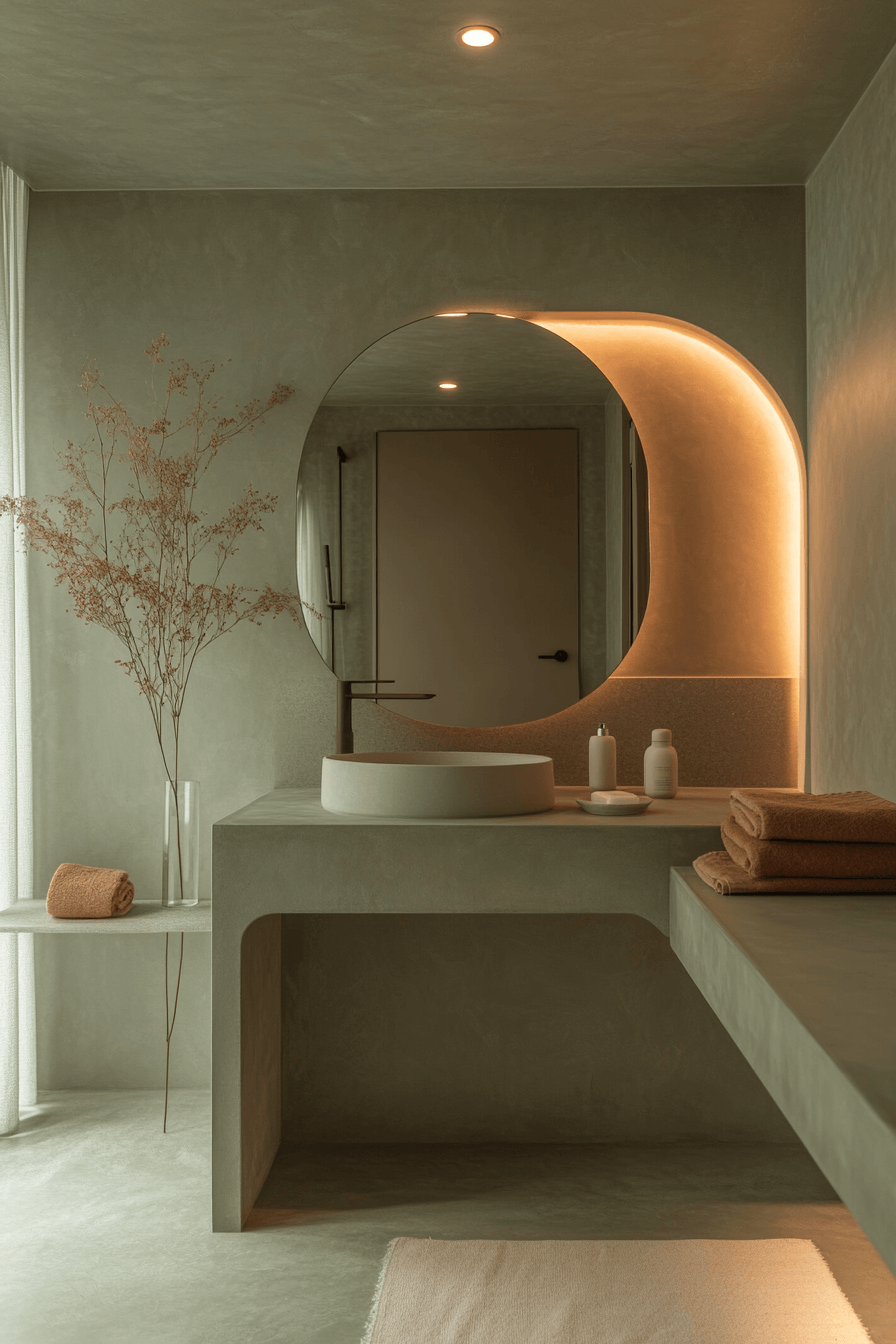 Curved mirrors soften a light sage green bathroom beautifully. The rounded shapes complement the organic tone of sage. Warm lighting enhances the tranquil glow. The space feels welcoming and thoughtfully styled. The curves add gentle movement to the room. Embrace rounded details for a softer finish.