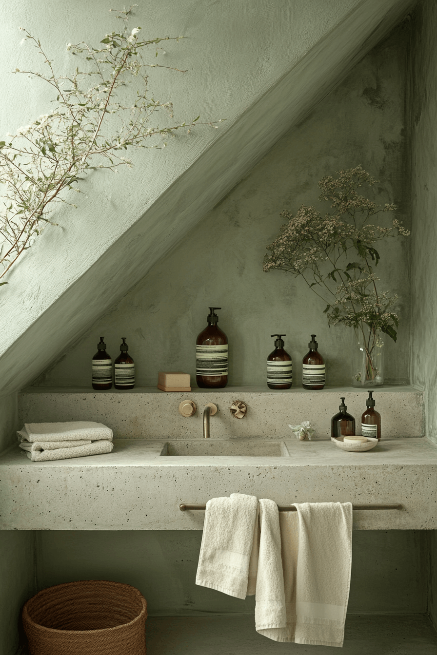 Concrete finishes paired with a light sage green bathroom create striking harmony. The raw texture gains softness from the gentle green tone. The contrast feels intentional and modern. Keeping the palette muted ensures cohesion. The space feels edgy yet serene. Explore this bold yet calming combination.