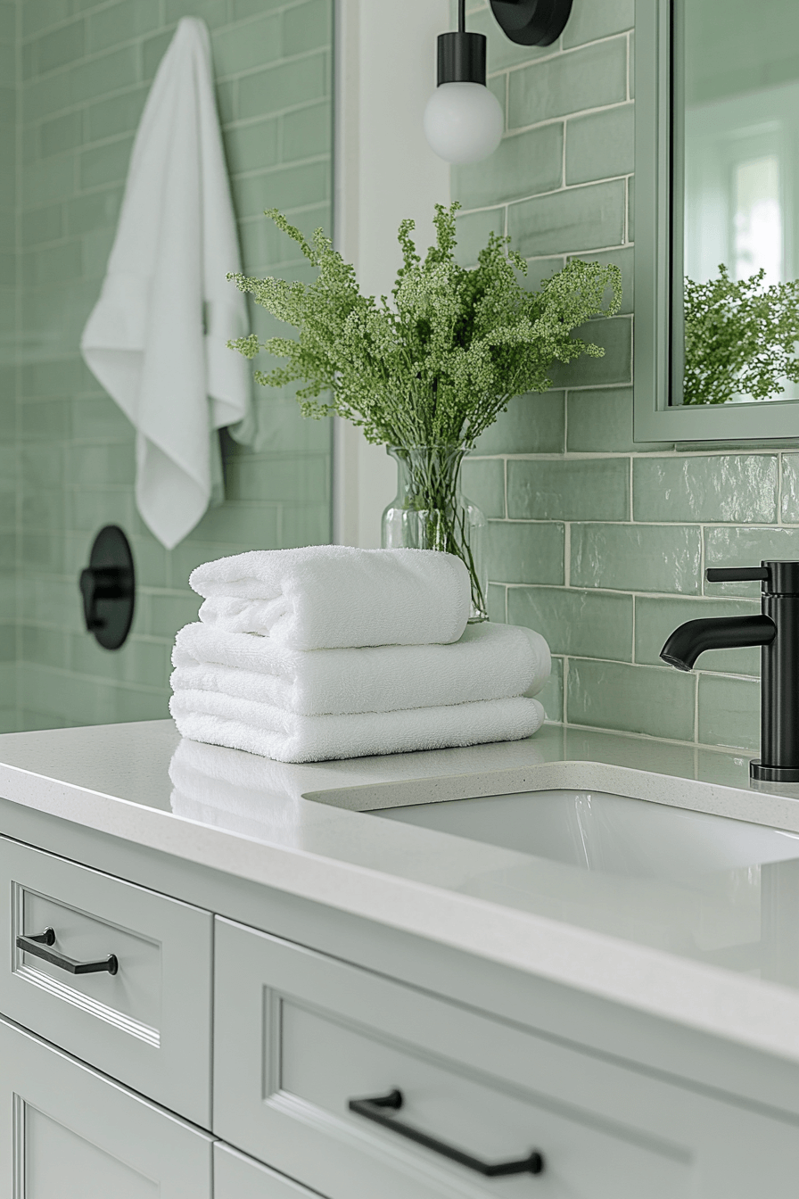 Introducing soft green tile instantly elevates a light sage green bathroom with subtle character. Whether behind the sink or inside the shower, the tile adds dimension while maintaining calm. The natural tone feels grounded and organic. Matte fixtures and neutral floors keep the look cohesive. The space feels polished yet inviting. Consider incorporating sage tile for an effortless transformation.