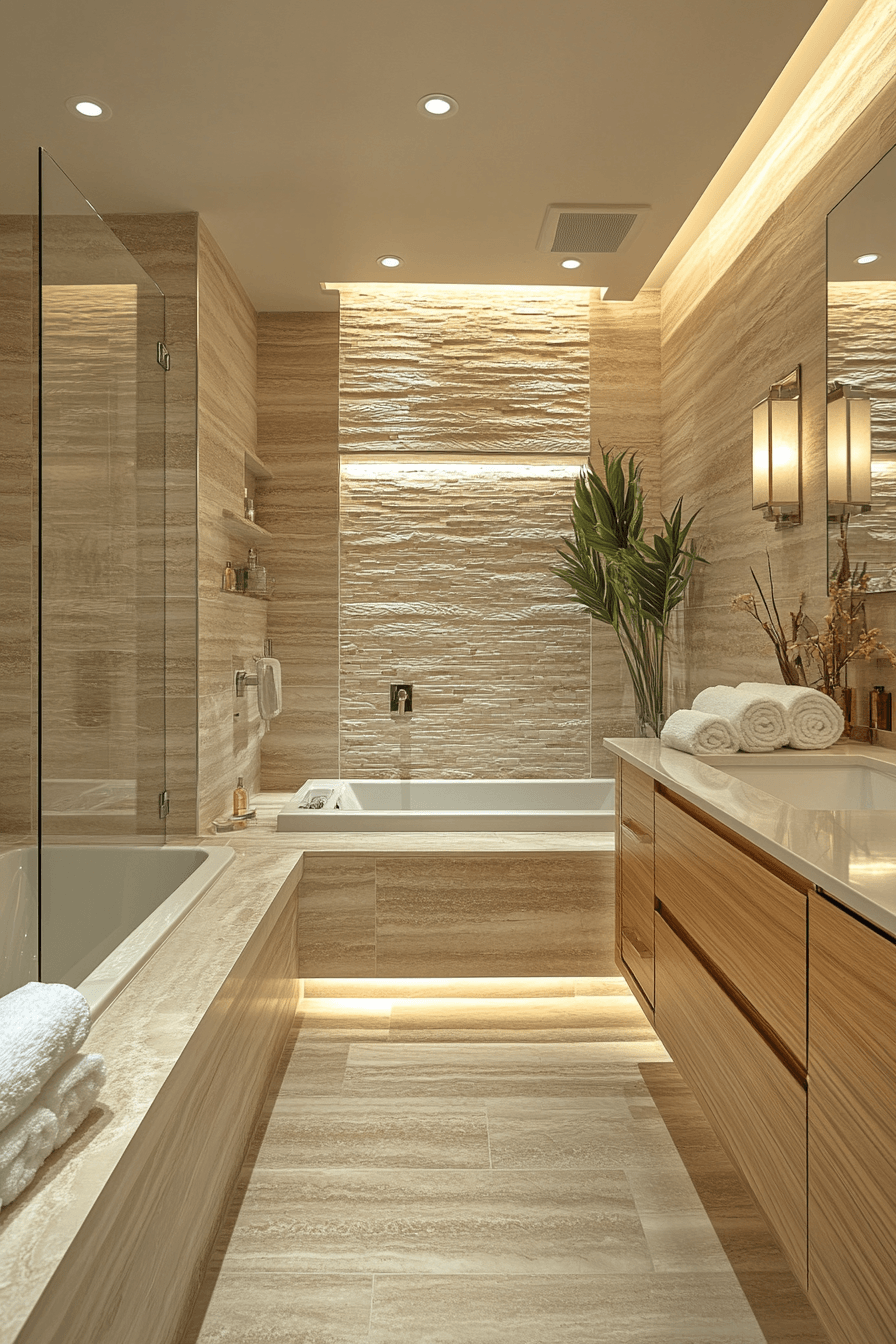 Natural stone textures ground luxurious bathrooms with organic elements that add depth and timeless appeal. Materials like slate and travertine create visual interest. Soft lighting enhances their natural beauty. Minimal decor keeps the focus on the materials. Clean lines balance the rugged textures. The space feels calm and refined. Bring nature into your bathroom today!