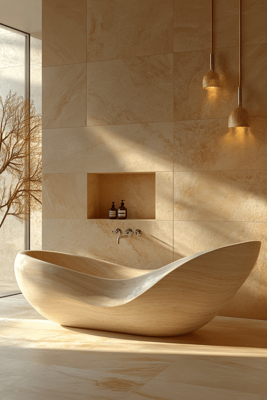 Sculptural bathtubs anchor luxurious bathrooms with bold shapes that create stunning focal points. Unique forms add artistic appeal. Surrounding materials enhance the design. Soft lighting highlights the tub’s silhouette. Minimal decor keeps the focus clear. The space feels refined and calming. Make your bathtub a statement piece today!