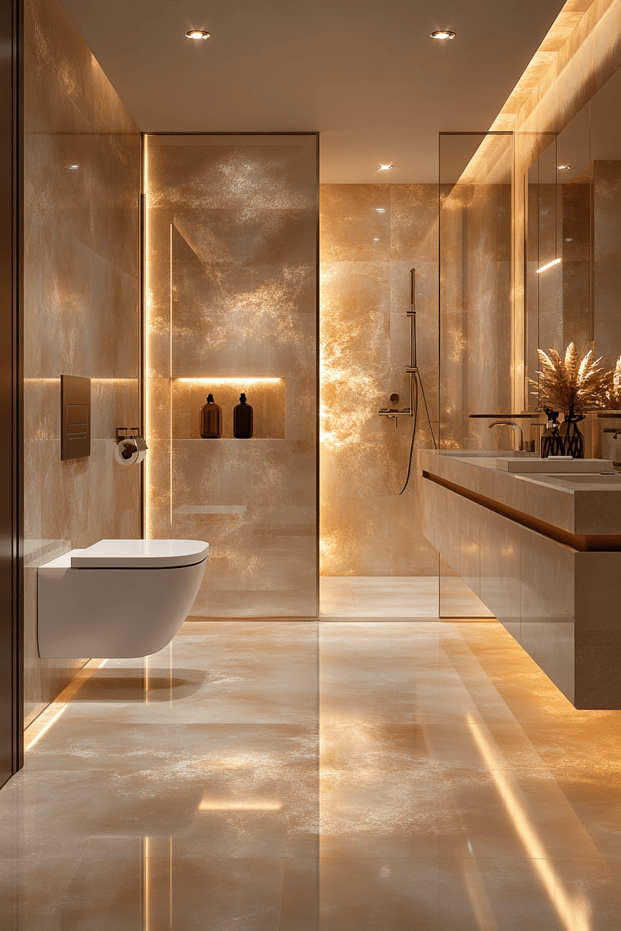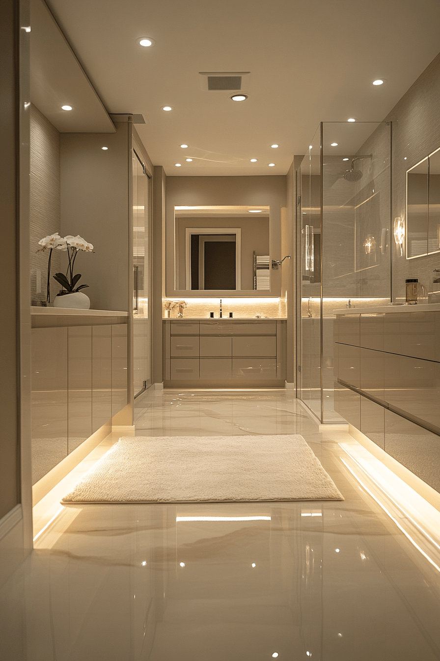 Layered glow lighting enhances luxurious bathrooms by creating a soft, immersive atmosphere that feels both modern and calming. Hidden light strips, backlit mirrors, and recessed fixtures work together to build depth. Light reflects gently across glass, stone, and metal surfaces, adding subtle movement. The illumination feels warm and balanced rather than harsh. Carefully placed lighting highlights key features without cluttering the design. The space feels radiant, serene, and elevated. Upgrade your bathroom with ambient glow lighting today!