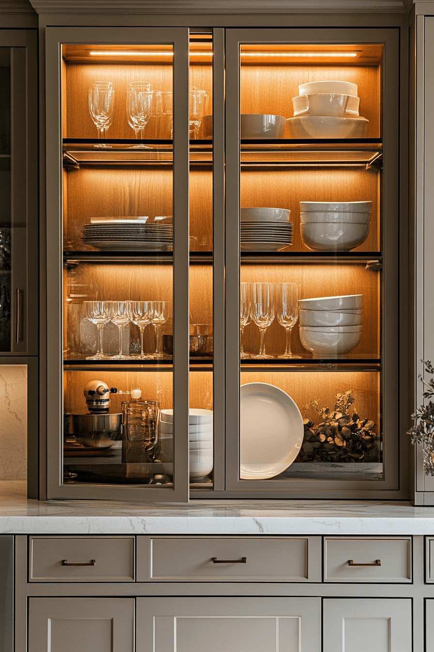 Glass-front cabinetry enhances luxurious kitchens by adding depth and display while keeping the space visually open. Transparent panels showcase curated items. Interior lighting highlights every detail. Sleek frames maintain a polished look. The design blends function with style effortlessly. The space feels light and sophisticated. Elevate your kitchen with glass details today!