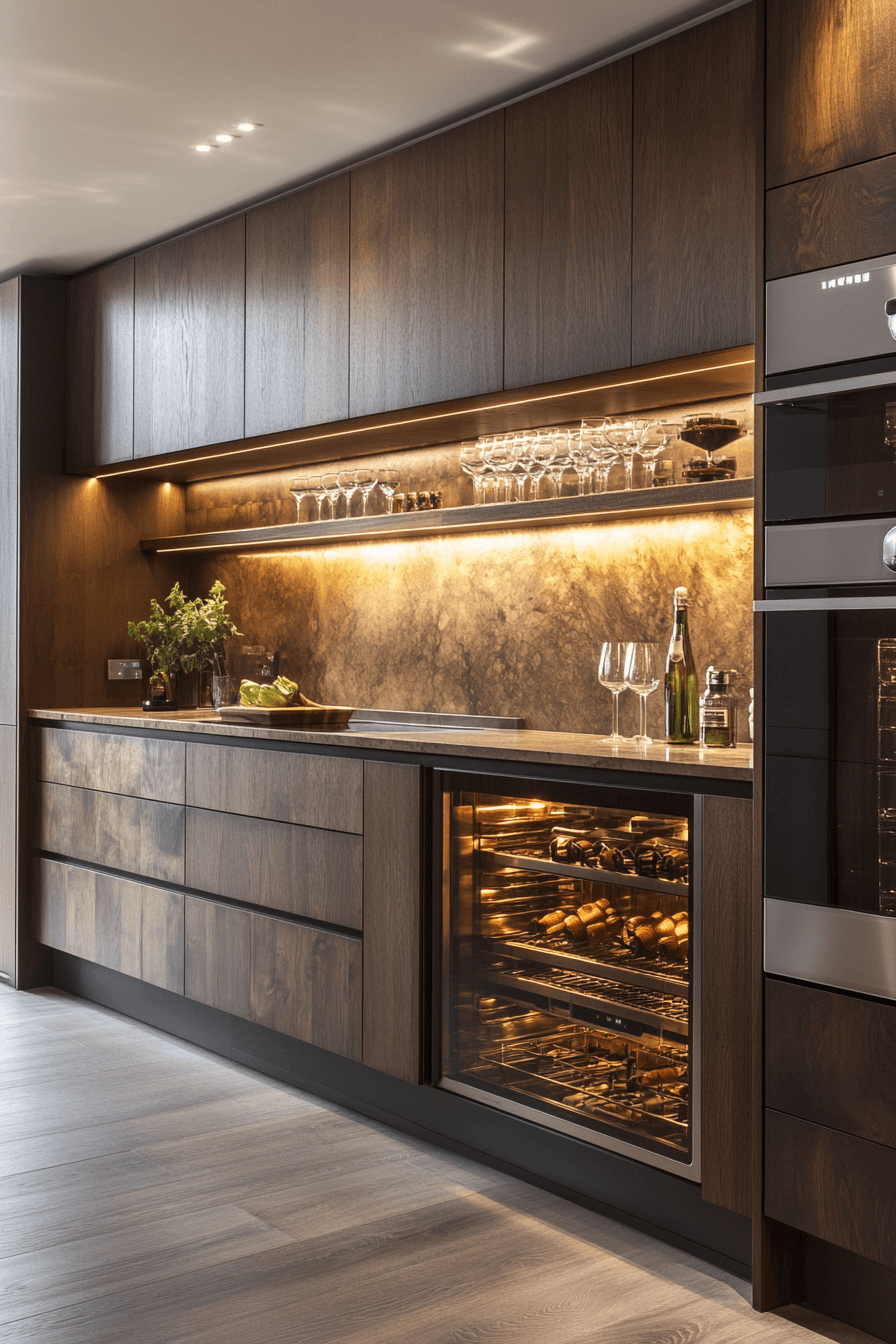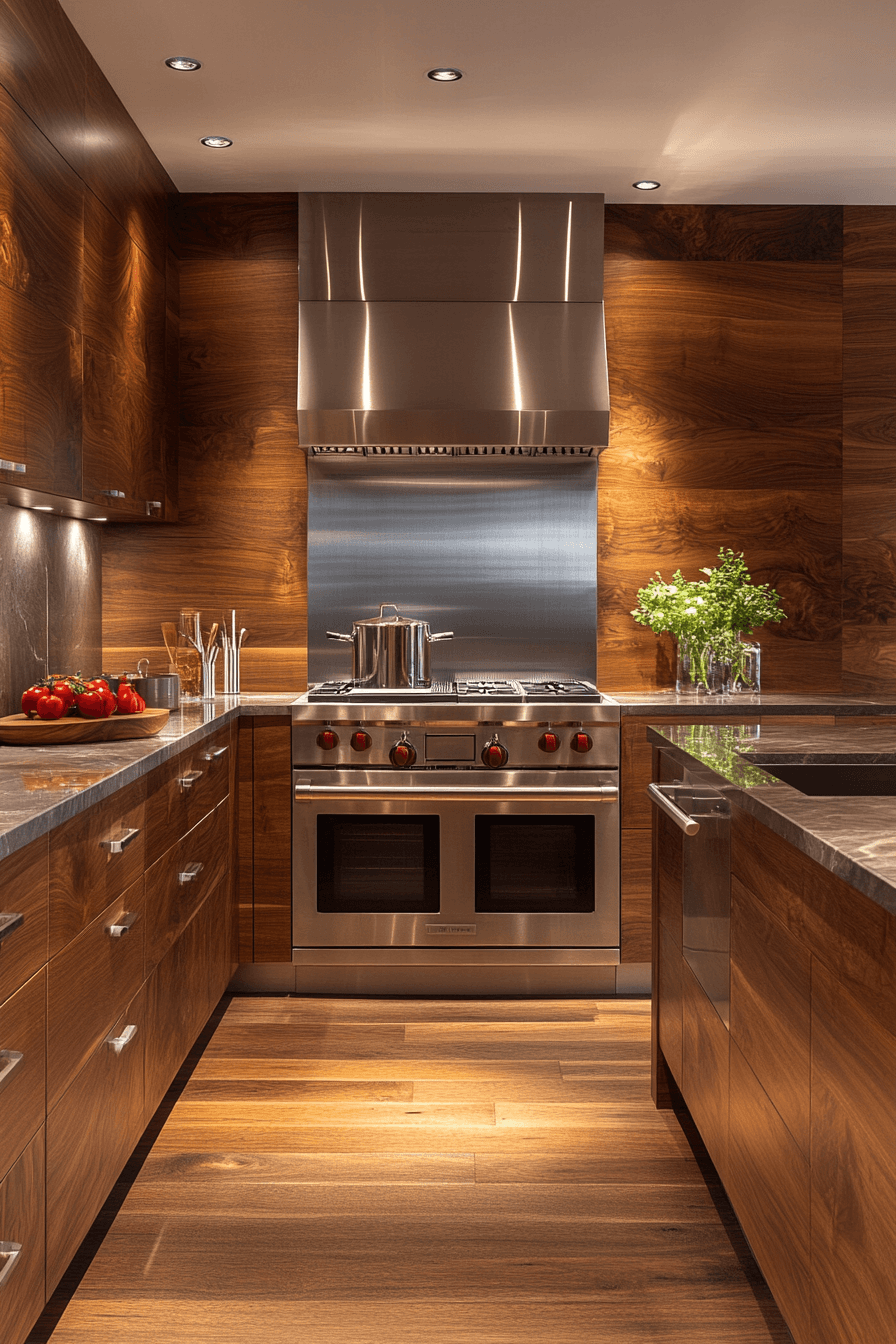 Wood panel finishes warm luxurious kitchens with natural textures that bring depth and timeless appeal. Smooth surfaces create a cohesive backdrop. Rich grain patterns add subtle movement. Warm tones balance modern elements. The design feels grounded and inviting. The space blends nature with sophistication. Add natural warmth to your kitchen today!