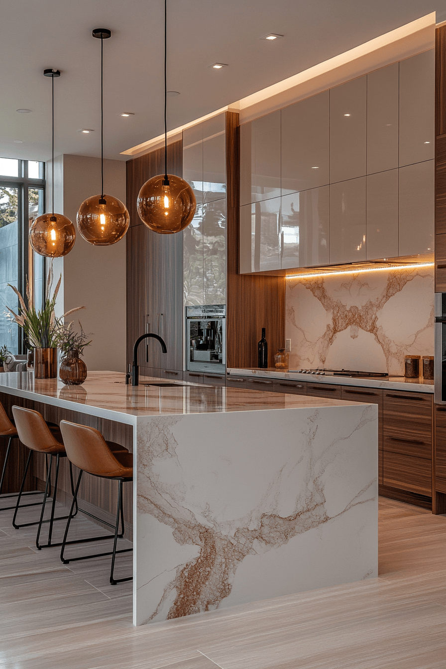 Statement islands anchor luxurious kitchens with bold designs that combine beauty and functionality. Large surfaces provide space for cooking and gathering. Unique materials draw immediate attention. Integrated features enhance usability. Lighting above the island adds focus and style. The design feels both striking and practical. Make your island the heart of your kitchen today!