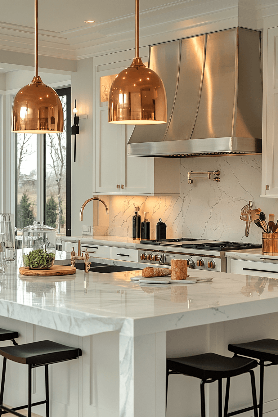 Metal accents enhance luxurious kitchens with reflective finishes that add shine and modern contrast. Hardware and fixtures introduce subtle glamour. Paired with neutral tones, metals stand out beautifully. Mixed finishes create layered depth. The design feels polished and refined. The space gains visual energy. Add metallic accents to your kitchen today!