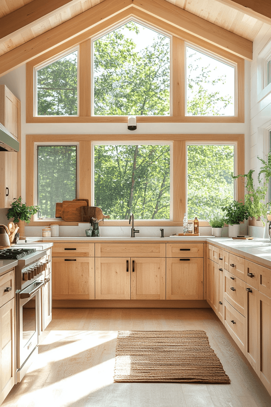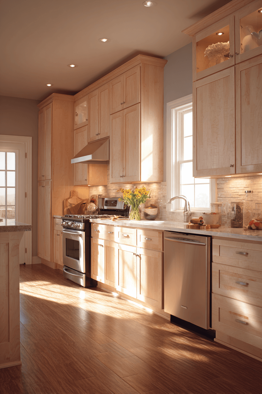 Bright maple kitchen cabinets enhance kitchens filled with natural light. Their pale tone reflects sunlight, creating a fresh and open environment. Gentle grain patterns add texture without heaviness. These cabinets are ideal for airy, open-concept homes. The mood feels cheerful and welcoming.