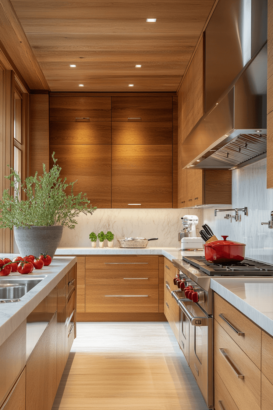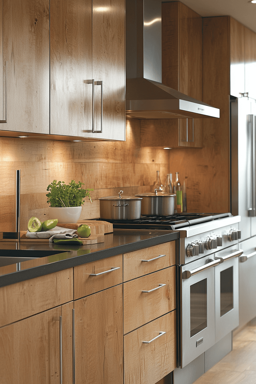 Minimalist maple kitchen cabinets prove that simplicity can feel powerful. Flat profiles and natural tones create clarity and confidence. The design highlights maple wood without distraction. These cabinets pair beautifully with handleless hardware. The space feels bold yet calm.