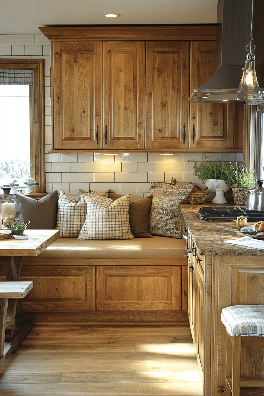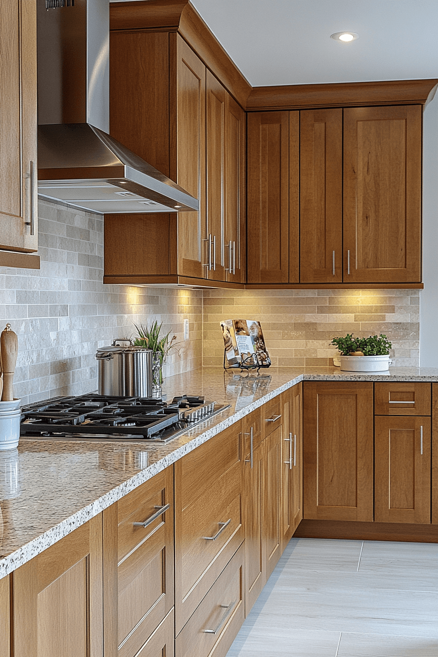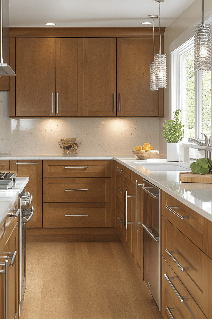 Golden-toned maple kitchen cabinets reflect light beautifully, making kitchens feel brighter and more energized. Their cheerful warmth adds an uplifting glow that enhances both small and open layouts. Maple’s smooth surface pairs easily with bold or neutral countertops. The result feels fresh, optimistic, and airy. This look is perfect for kitchens that crave light and warmth.