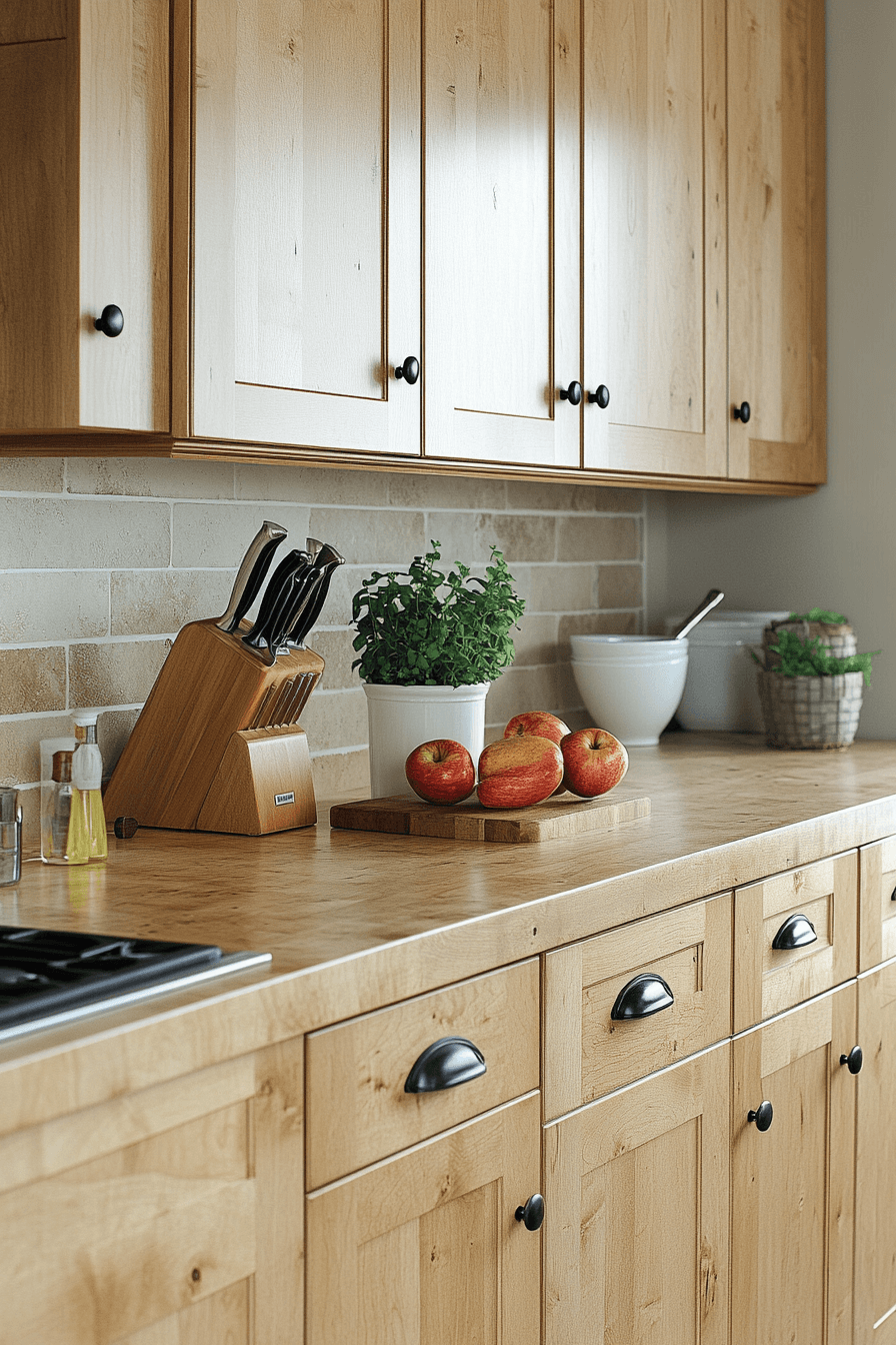 Clean-profile maple kitchen cabinets highlight simplicity and functionality. Their streamlined design allows maple’s natural grain to shine. This look suits modern, Scandinavian, and Japandi kitchens beautifully. Minimal detailing keeps the space visually calm. The result feels intentional and stylish.
