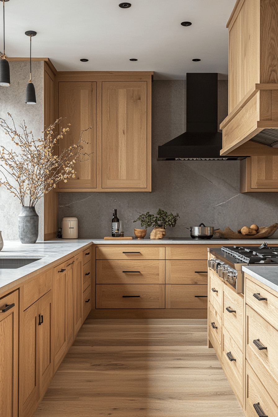 Light maple kitchen cabinets bring softness and balance to minimalist kitchens. Their gentle tone keeps the space warm without feeling busy or overwhelming. Clean design allows lighting, hardware, and surfaces to stand out. These cabinets support a peaceful, intentional cooking environment. They feel simple yet thoughtfully designed.