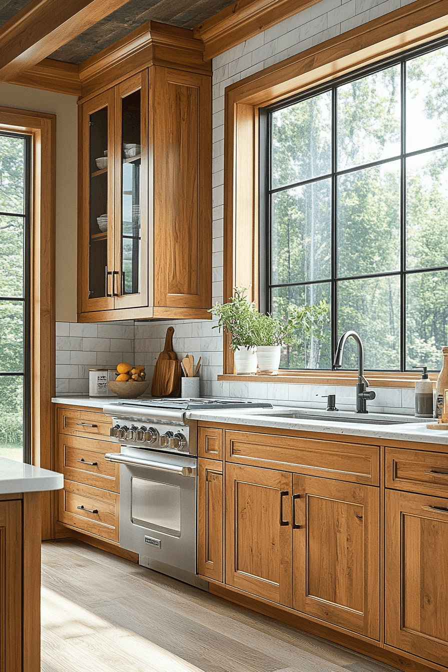 Golden-toned maple kitchen cabinets reflect light beautifully, making kitchens feel brighter and more energized. Their cheerful warmth adds an uplifting glow that enhances both small and open layouts. Maple’s smooth surface pairs easily with bold or neutral countertops. The result feels fresh, optimistic, and airy. This look is perfect for kitchens that crave light and warmth.