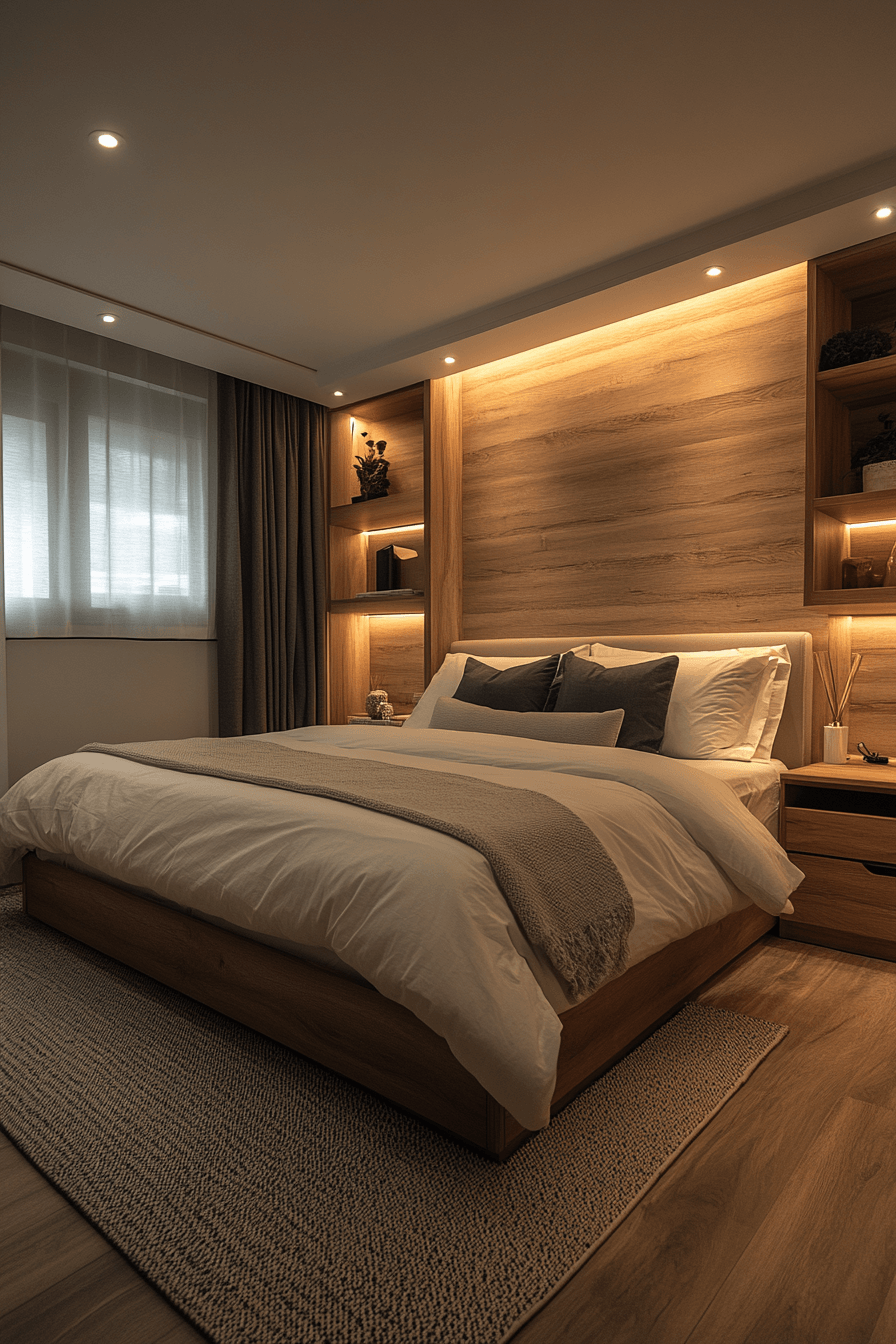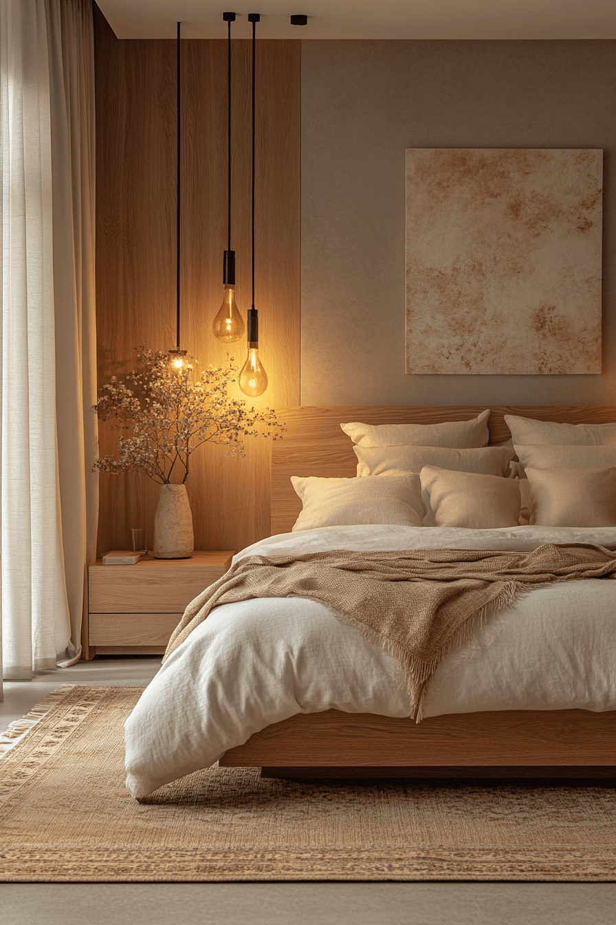 Warm neutral tones shape a modern bedroom interior into a soft and grounded space filled with comfort and ease. Shades of beige and cream create a gentle backdrop. Natural wood adds warmth and texture. Layered bedding enhances coziness. Soft lighting completes the relaxed feel. The design feels welcoming and serene. Create a warm and inviting bedroom today!