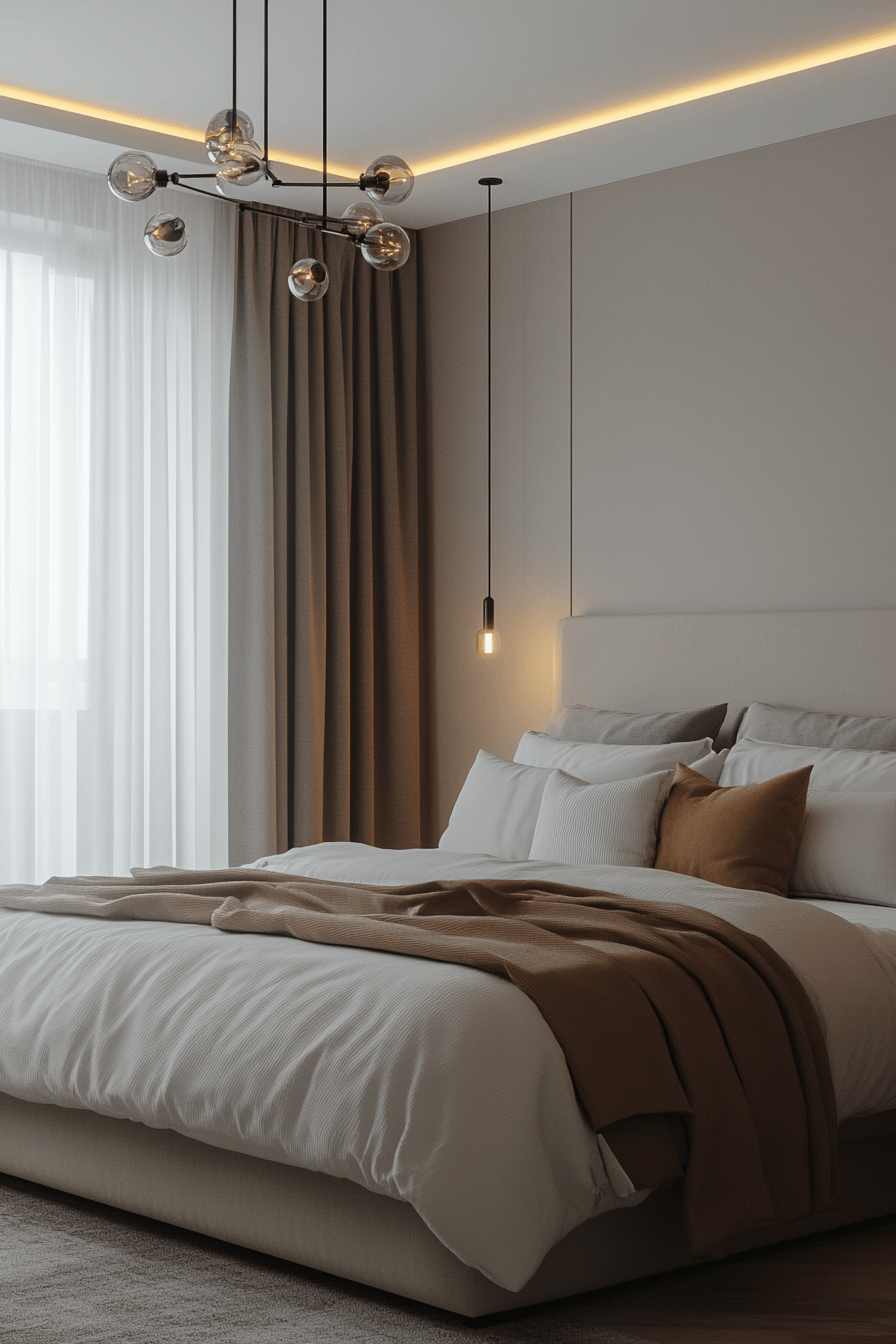 Statement lighting transforms a modern bedroom interior by becoming a standout feature that defines the entire space. Sculptural fixtures draw attention and add personality. Layered lighting enhances warmth and depth. Minimal furniture allows the lighting to shine. The design feels bold yet balanced. The overall effect is modern and dynamic. Illuminate your bedroom with style today!