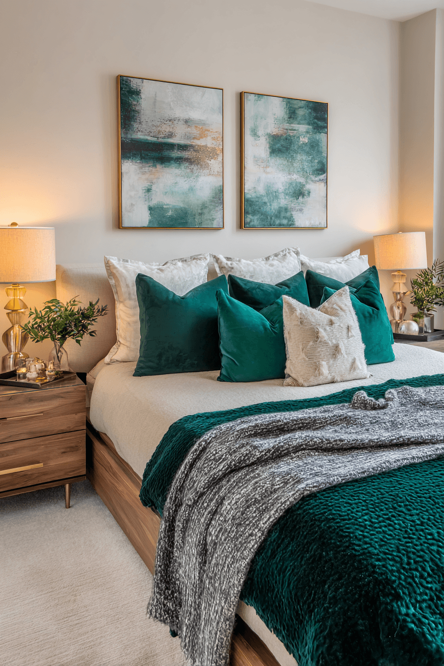 Bold color accents bring life into a modern bedroom interior while maintaining a clean and balanced design. Jewel tones stand out beautifully against neutral backgrounds. Layered textiles add depth and personality. Sleek furniture keeps everything grounded. Coordinated decor ties the palette together. The result feels vibrant and stylish. Experiment with color in your bedroom today!