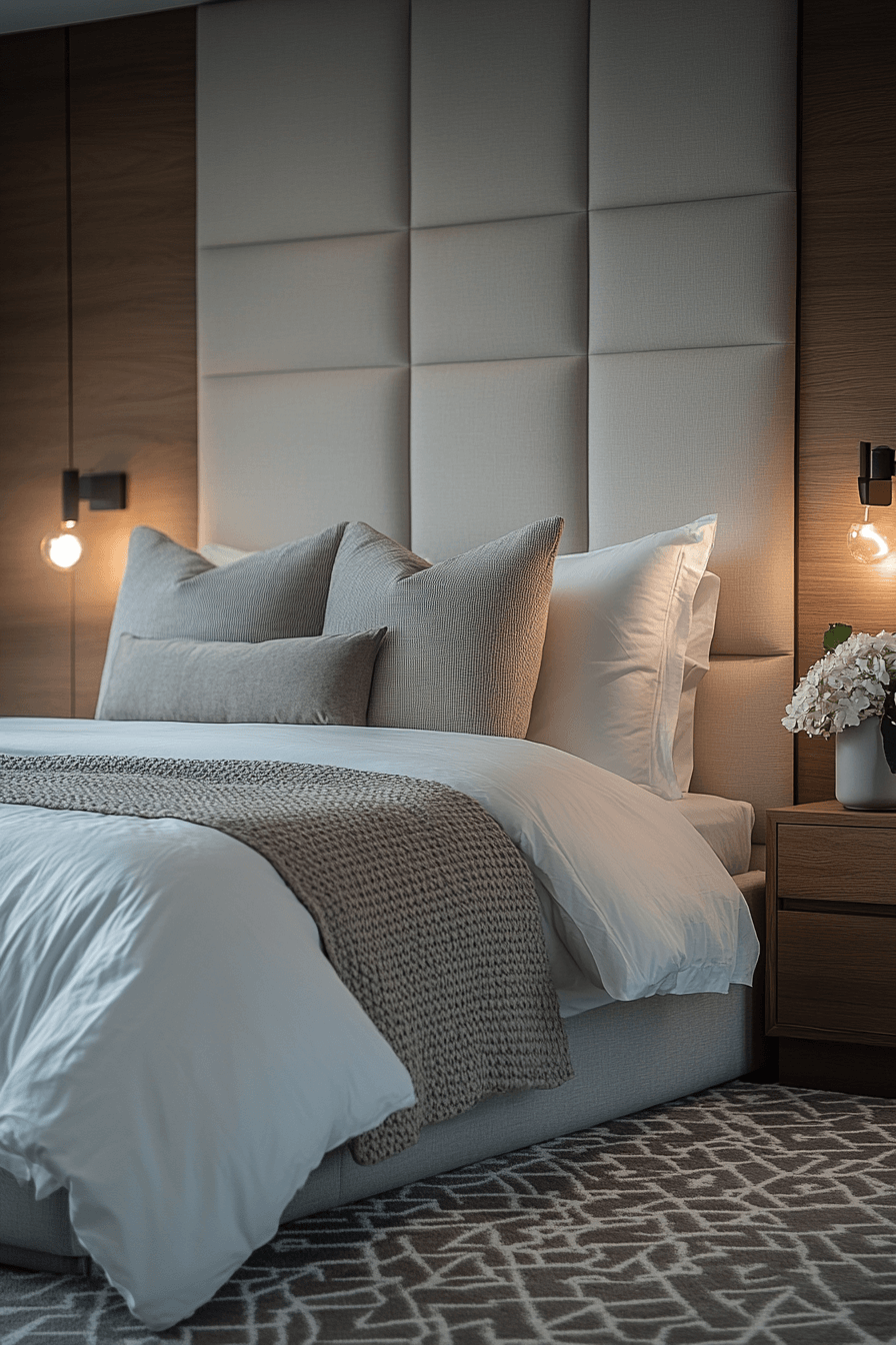 Hotel-inspired design transforms a modern bedroom interior into a luxurious retreat that feels indulgent and welcoming. Plush bedding creates a cozy focal point. Upholstered elements add softness and elegance. Neutral walls keep the space calm. Layered lighting enhances warmth. The overall feel is upscale and relaxing. Bring hotel luxury into your home today!