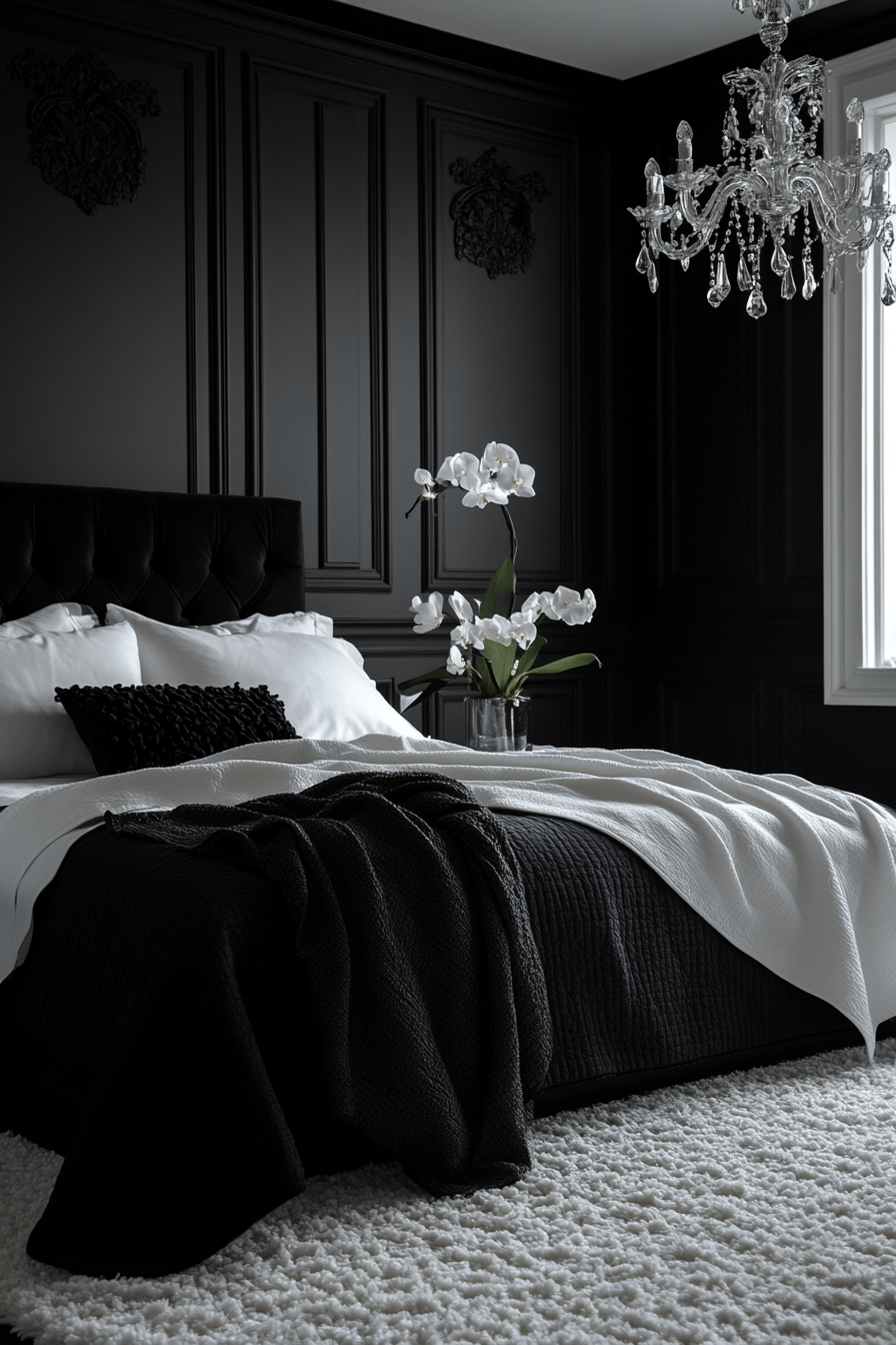 High-contrast styling brings energy into a modern bedroom interior with bold visual balance and sharp definition. Black and white tones create a striking foundation that feels modern and polished. Clean furniture lines keep the space structured and uncluttered. Minimal decor ensures the contrast remains the highlight. Metallic accents add a soft glow and depth. The result feels bold yet refined. Elevate your bedroom with this dramatic style today!