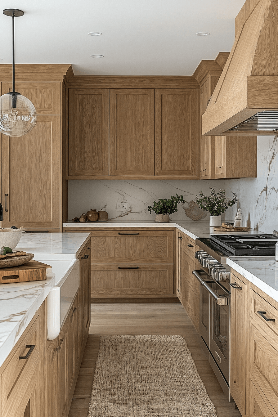 Pale oak cabinetry brightens this modern luxury kitchen with natural warmth. Marble counters add refined contrast. Comfortable island seating invites lingering conversations. Integrated appliances maintain visual calm. The atmosphere feels welcoming yet polished. Tap to explore how pale oak can elevate your modern luxury kitchen!