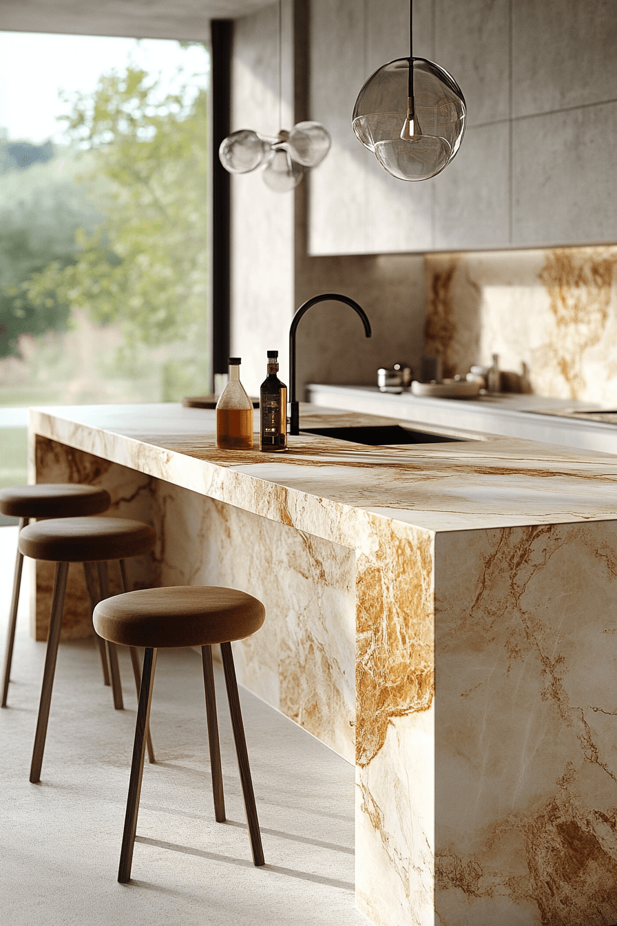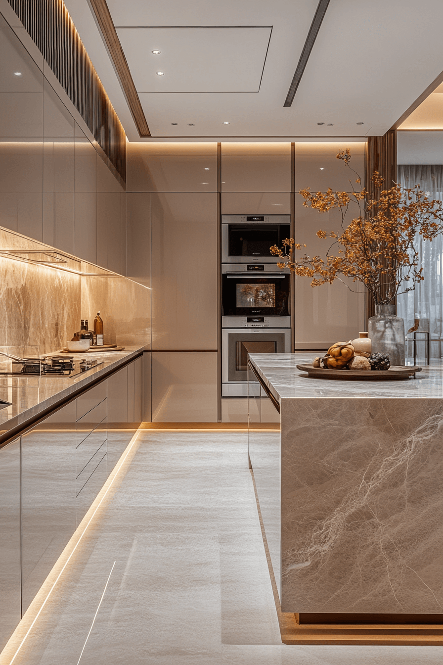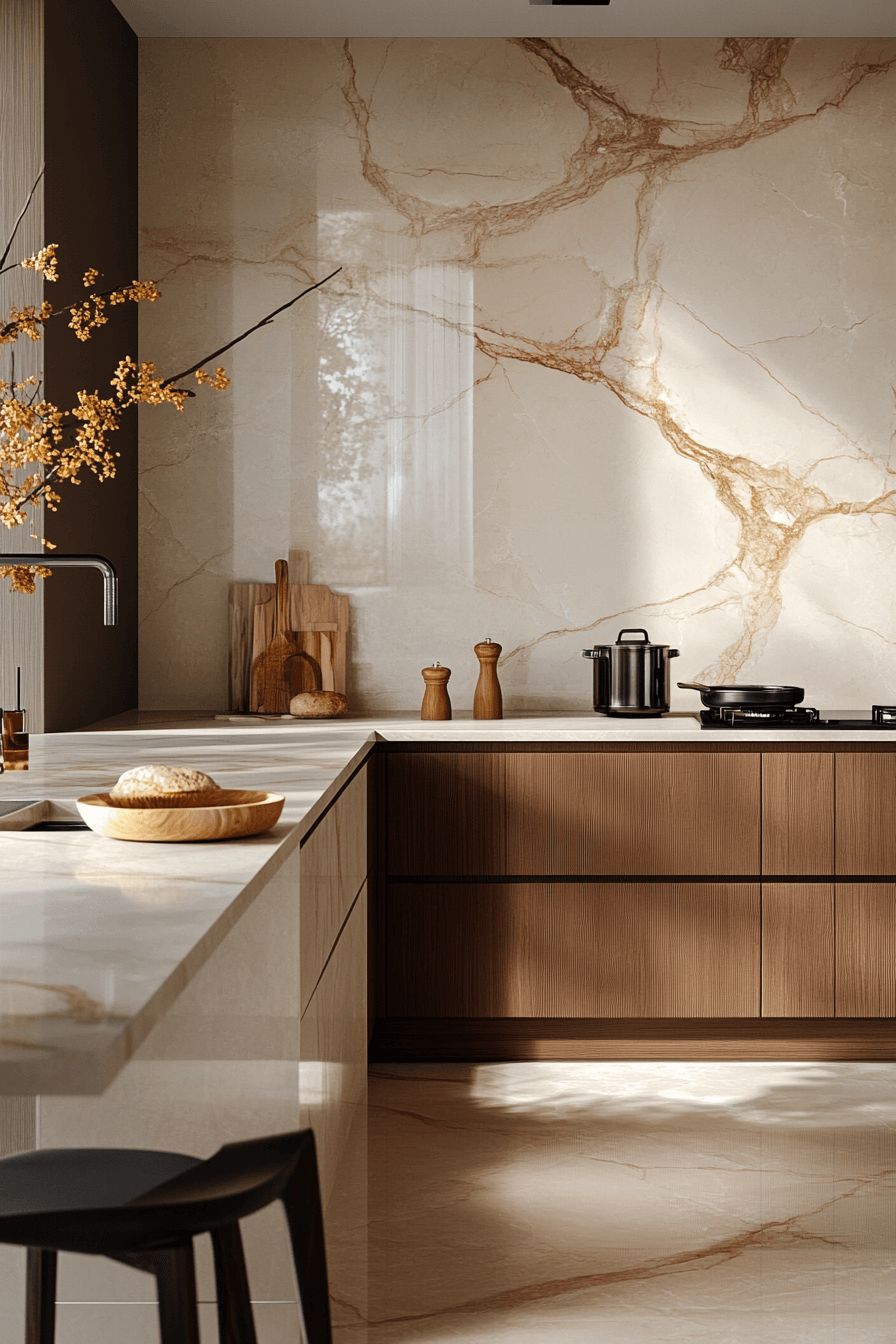Soft stone tones wrap this modern luxury kitchen in warmth and subtle texture. Gently veined surfaces add depth without overpowering the space. A generous island invites gathering and conversation. Minimal hardware keeps every surface smooth and uninterrupted. The atmosphere feels both relaxed and elevated. Tap to explore a plush stone-inspired modern luxury kitchen!
