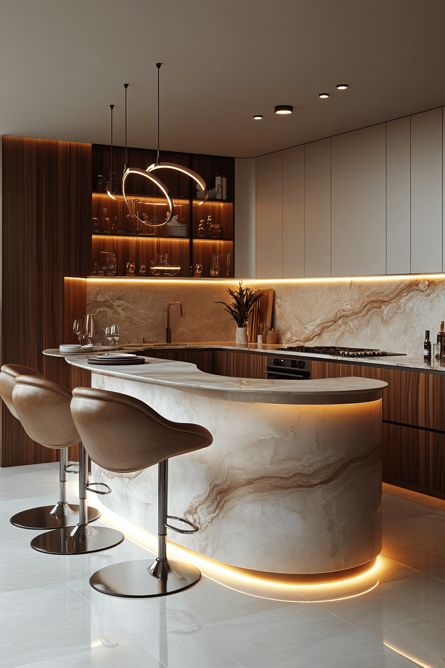A sculptural island paired with statement stools anchors this modern luxury kitchen beautifully. Coordinated finishes tie seating and cabinetry together. Focused lighting enhances the gathering space. The island becomes both art and utility. Social energy meets refined design. Click to elevate your modern luxury kitchen with sculpted seating!