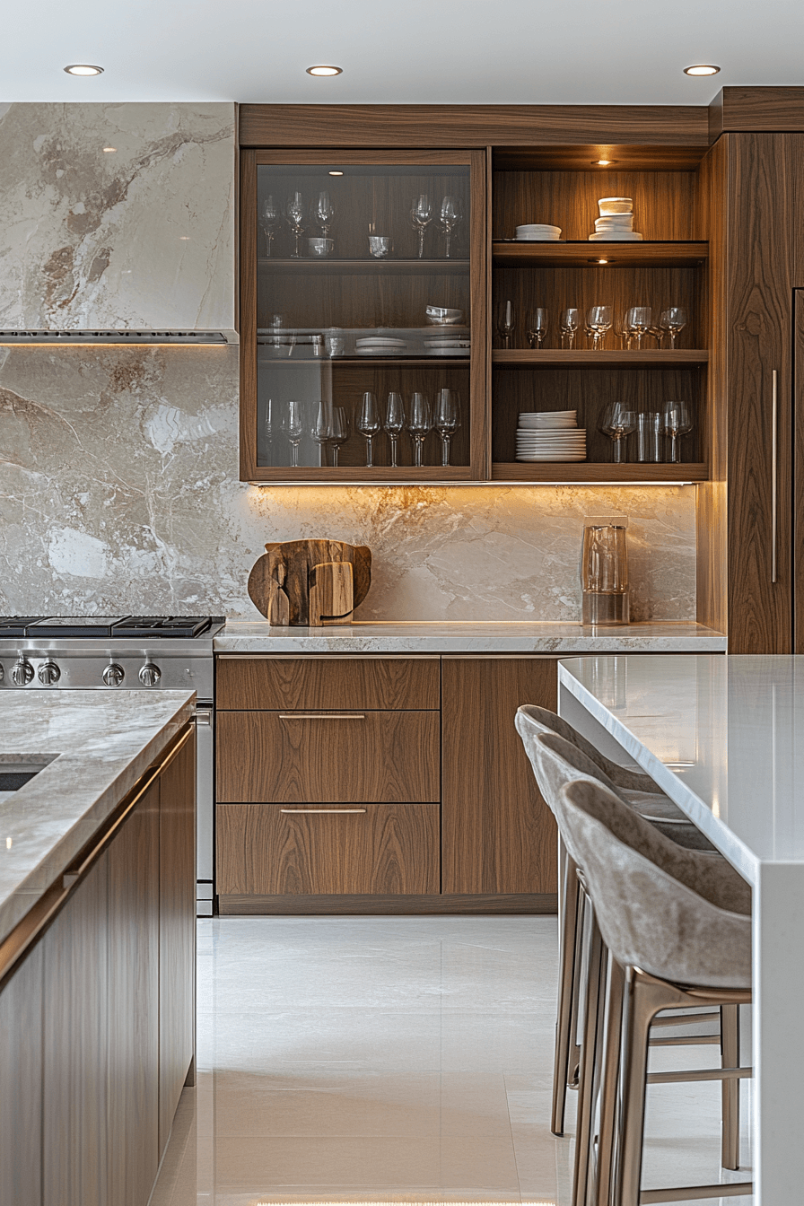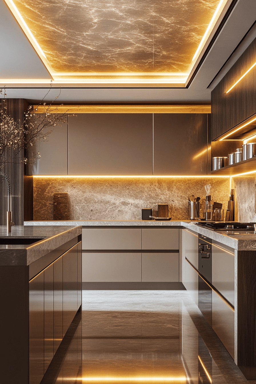 A smoky mirror backsplash introduces depth and modern glamour to this modern luxury kitchen. The tinted reflection expands the room subtly. Under-cabinet lighting enhances the shimmer. Neutral cabinetry prevents visual overload. Reflection becomes a design feature rather than a distraction. Tap to explore mirror-backed modern luxury kitchen inspiration!