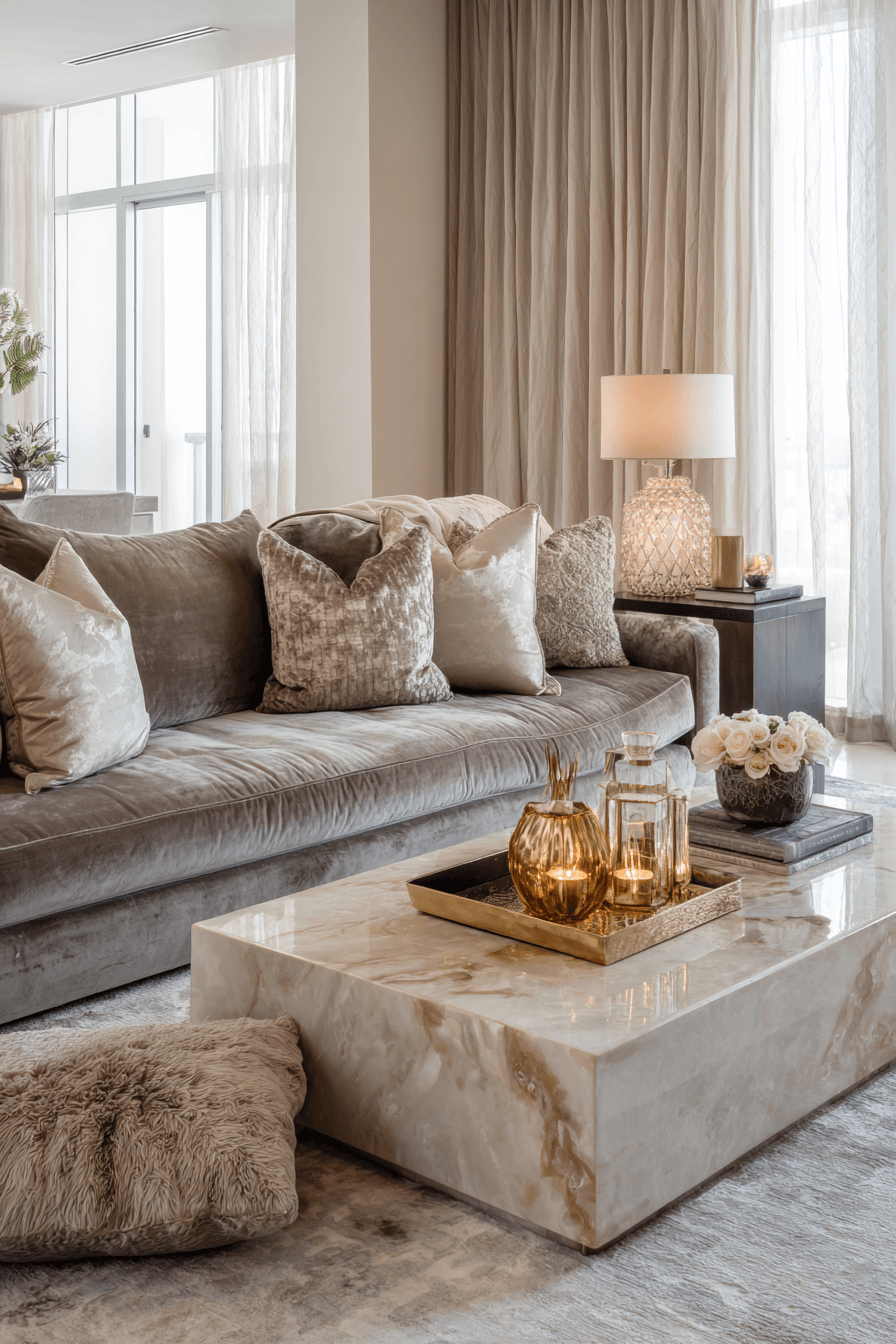 A sumptuous velvet sofa anchors this modern luxury living room with irresistible softness and depth. The plush upholstery contrasts beautifully with sleek stone accents and subtle metallic details. Layered pillows and a sculptural coffee table add dimension without overwhelming the layout. Floor-to-ceiling drapery and warm ambient lighting create an intimate cocoon effect. The result feels refined yet incredibly inviting. Click to discover how a velvet-centered modern luxury living room can transform your space!