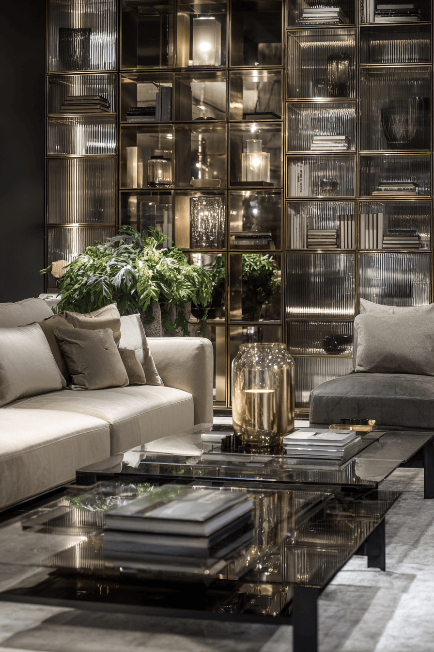 Smoked glass tables and accents introduce subtle drama into this modern luxury living room. The tinted transparency adds depth without heaviness. Soft lighting reflects gently on the surfaces. Plush seating keeps the space welcoming. Transparency and texture coexist beautifully. Tap to explore how smoked glass can enrich your modern luxury living room!