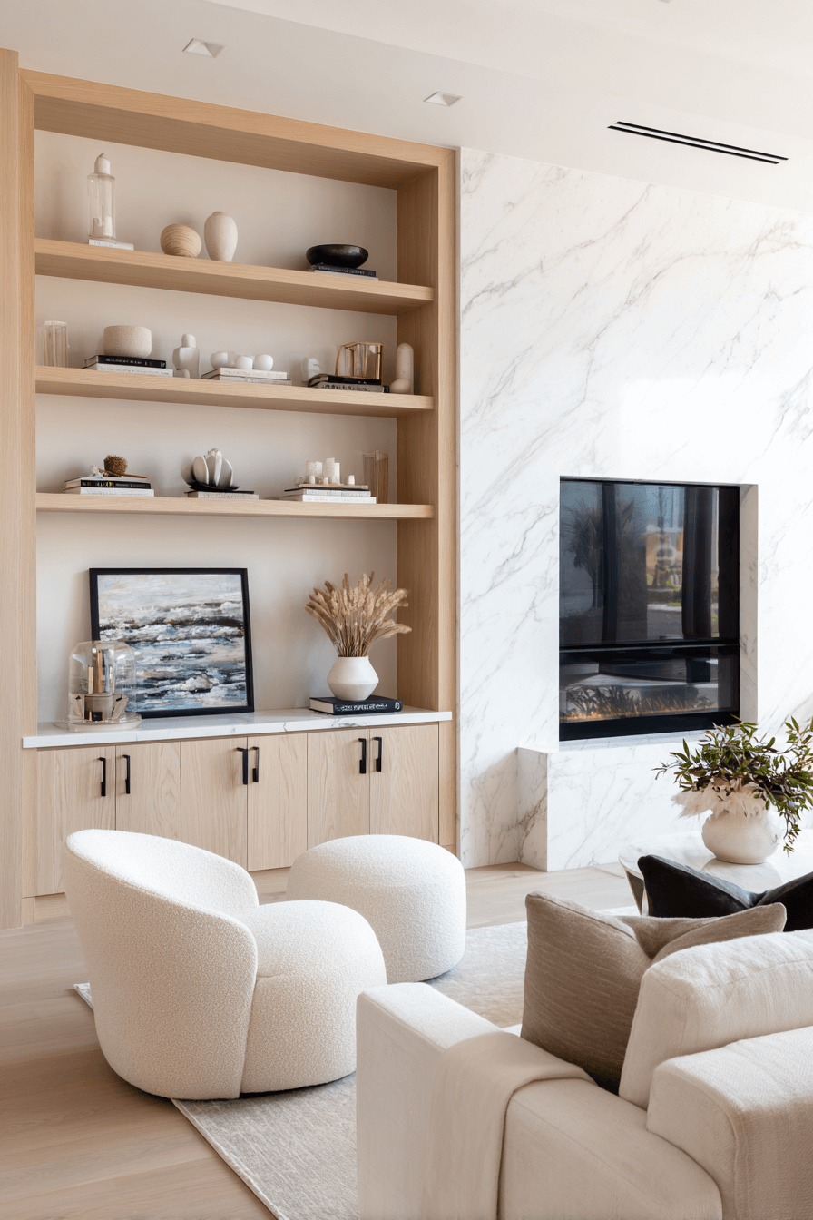 Pale oak finishes infuse this modern luxury living room with natural warmth. The light wood pairs beautifully with marble and matte metals. Open shelving showcases curated art and decor. Clean lines keep the look contemporary rather than rustic. The balance feels inviting yet upscale. Click to see how pale oak can elevate your modern luxury living room!
