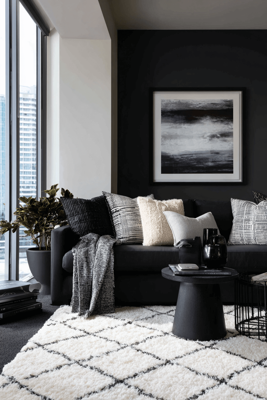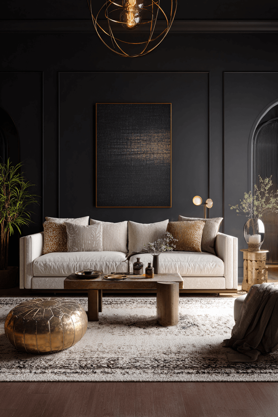 Deep matte charcoal walls create moody sophistication in this modern luxury living room. Light upholstery adds contrast and balance. Plush rugs soften the dramatic palette. Thoughtful lighting prevents heaviness. The design merges boldness with warmth. Tap to discover how charcoal can redefine your modern luxury living room!