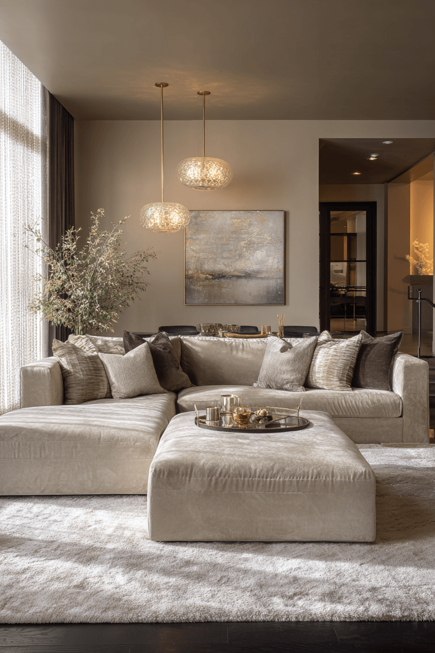 Warm taupe tones wrap this modern luxury living room in understated elegance. Oversized seating encourages relaxation and connection. Layered lighting enhances the cozy glow. Subtle metallic and glass accents add polish. The atmosphere feels welcoming yet refined. Click to explore how taupe can enrich your modern luxury living room!