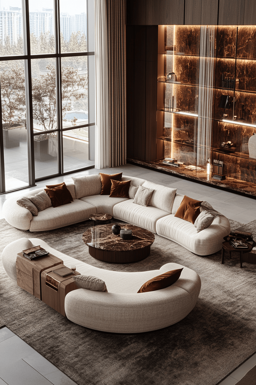 A curved sectional brings sculptural softness into this modern luxury living room. The rounded form encourages connection while adding architectural interest. A circular coffee table reinforces cohesion and flow. Neutral fabrics prevent the curves from feeling overly trendy. The space feels conversational, elegant, and contemporary. Click to see how curved seating can redefine your modern luxury living room!