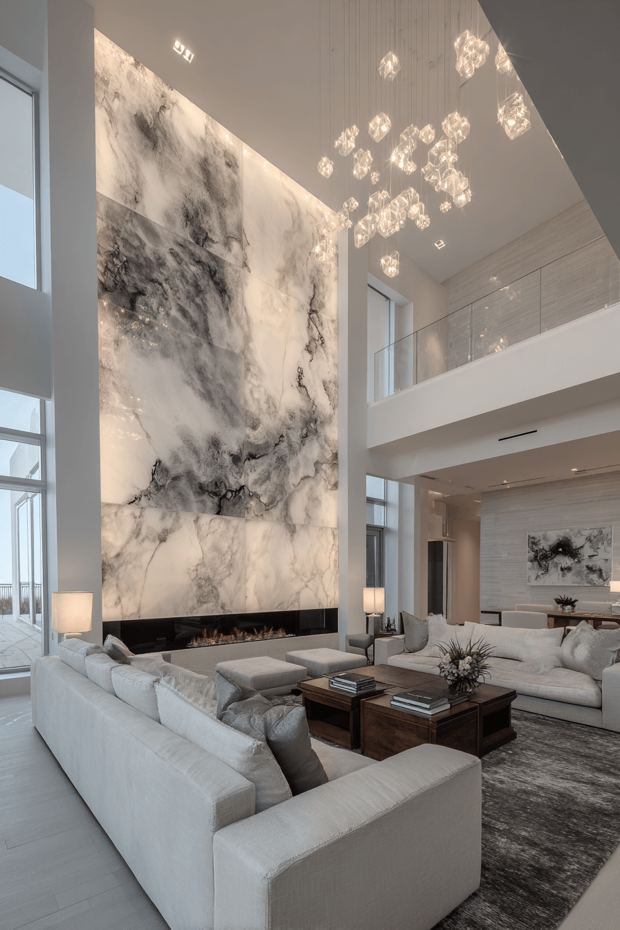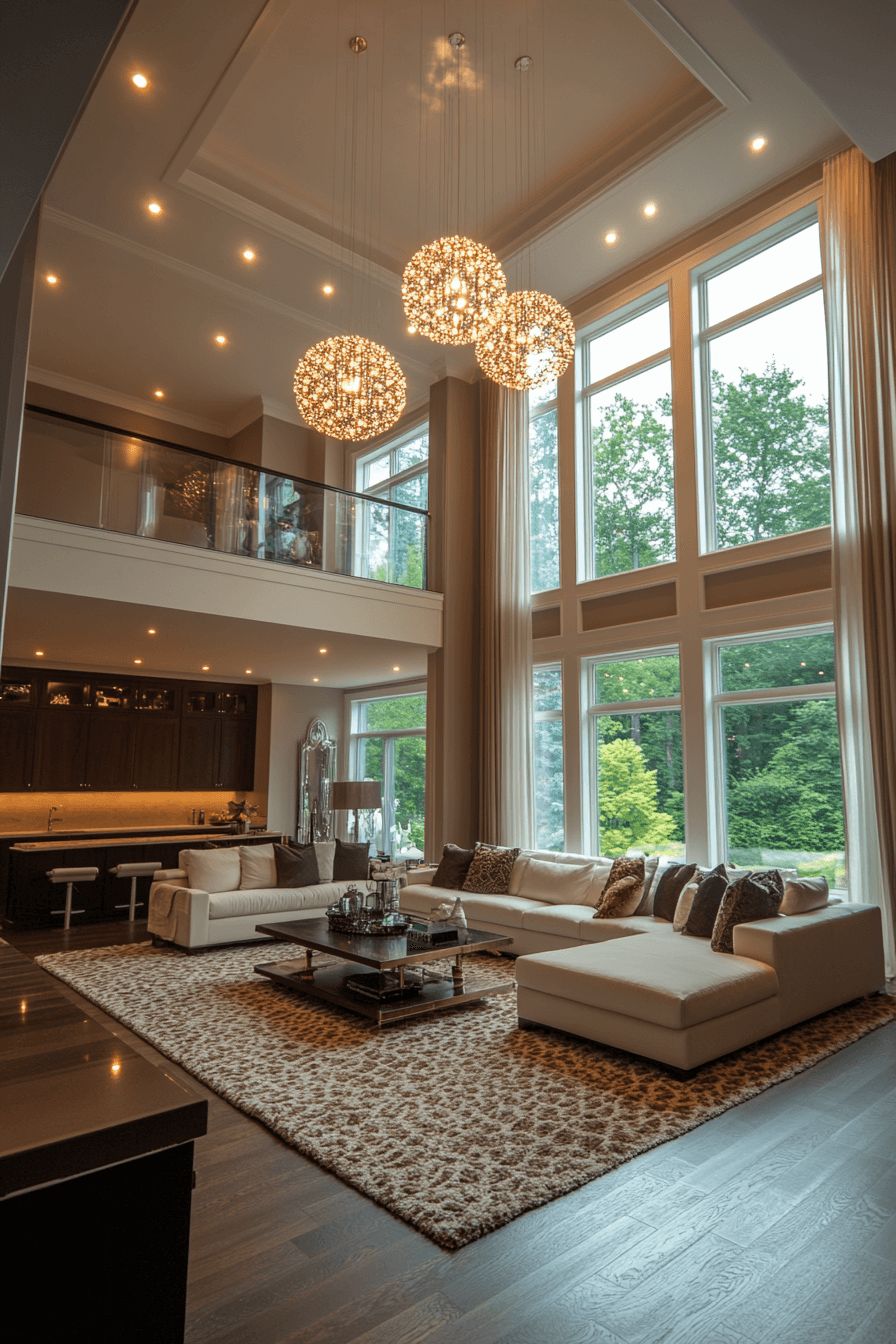 Soaring ceilings amplify grandeur in this modern luxury living room. Statement lighting draws the eye upward. Tall drapery balances the scale beautifully. Oversized artwork anchors the vertical space. Sleek furnishings keep everything grounded. Click to explore how dramatic height can transform your modern luxury living room!