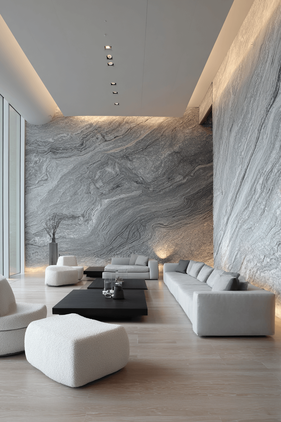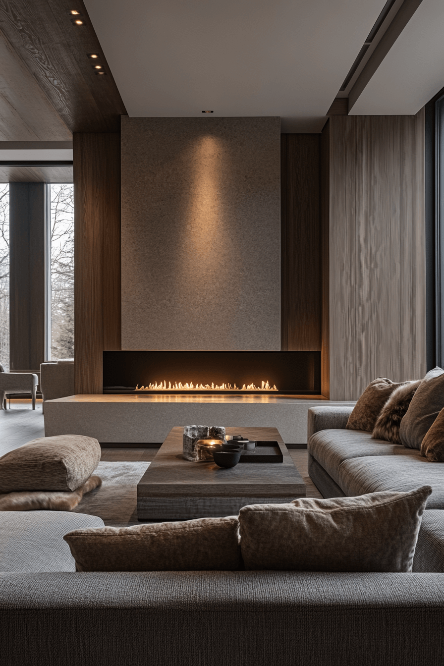 Cool slate hues blended with sandy neutrals give this modern luxury living room a perfectly balanced palette. Textured stone walls meet soft upholstered seating for layered contrast. Minimal silhouettes keep the aesthetic clean and current. Subtle metallic touches add quiet sophistication. The harmony between earthy and sleek elements feels effortless. Tap to explore how slate and sand can elevate your modern luxury living room!