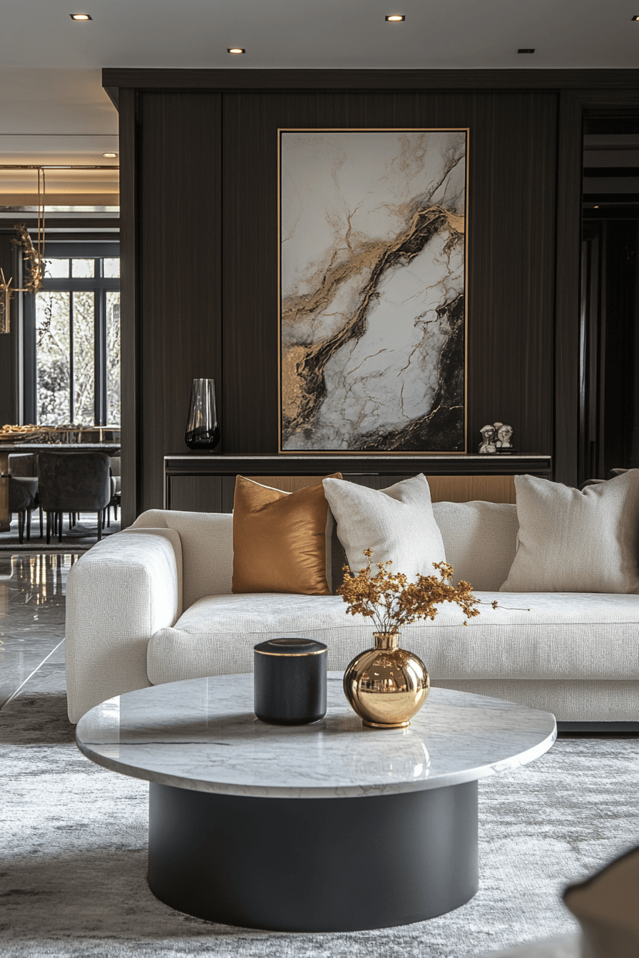 A bold black-and-white palette gives this modern luxury living room graphic sophistication. High contrast creates striking visual interest. Textured fabrics prevent the space from feeling flat. Streamlined shapes maintain clarity and polish. The result feels timeless yet modern. Tap to discover how monochrome styling can transform your modern luxury living room!