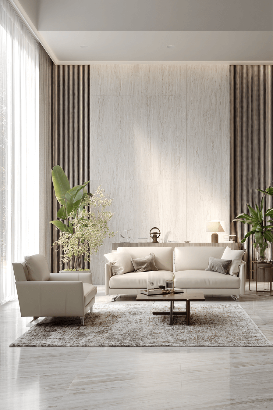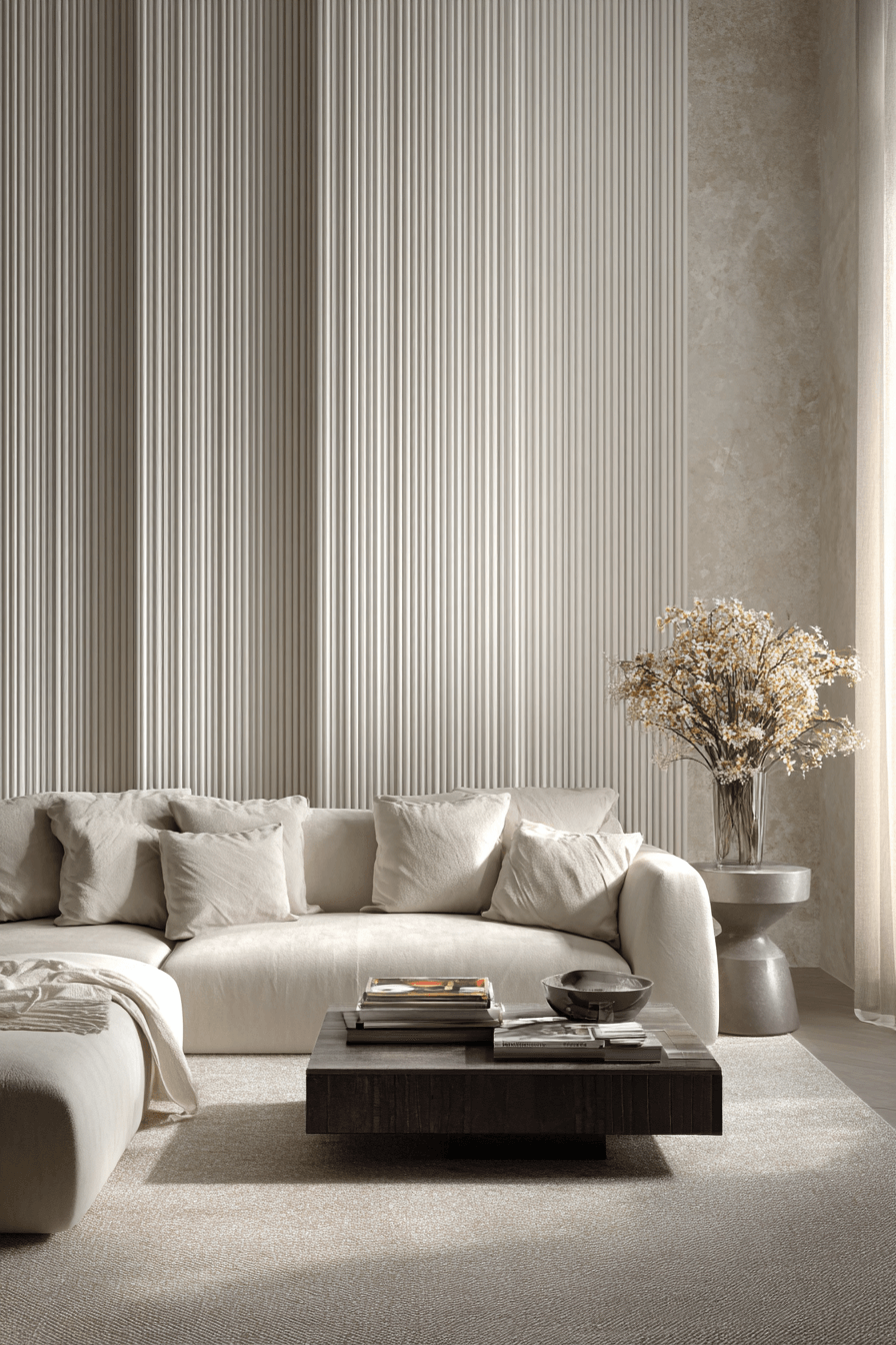 Fluted wall panels add subtle texture to this modern luxury living room. Vertical lines introduce rhythm without clutter. Warm lighting enhances dimensional detail. Plush seating balances the architectural elements. The look feels detailed yet streamlined. Tap to see how fluted accents can refine your modern luxury living room!