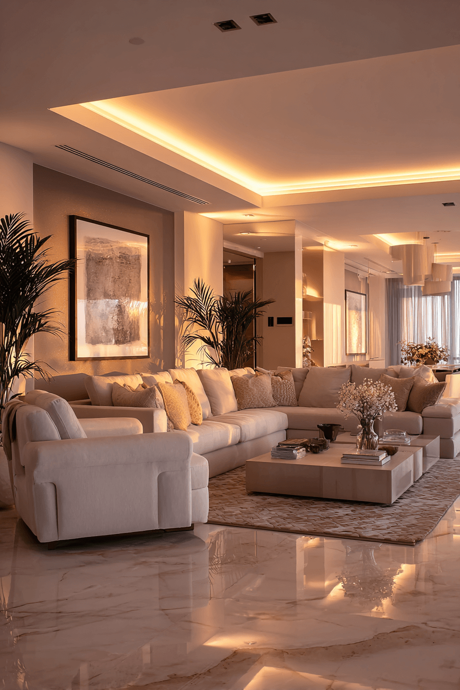 Layered lighting defines the mood of this modern luxury living room. Recessed fixtures, sconces, and hidden LEDs create depth. Neutral furnishings reflect the glow beautifully. Minimal decor keeps attention on atmosphere. The lighting feels architectural and intentional. Click to explore how ambient layers can transform your modern luxury living room!
